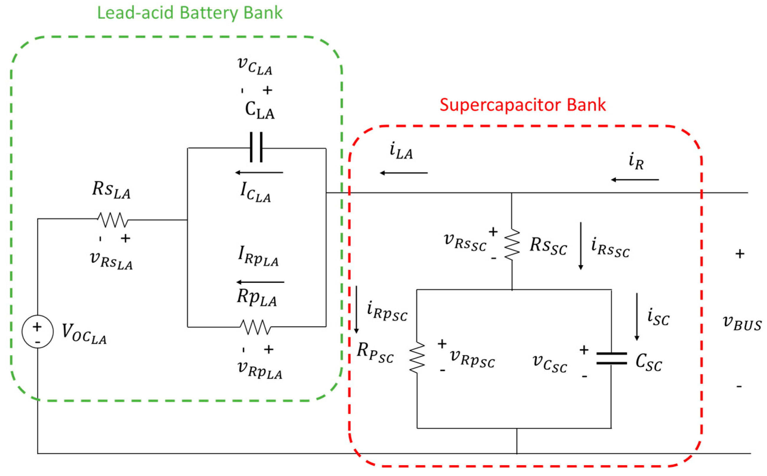 To develop a model that balances accuracy with low computational cost, first-order Thévenin models have been selected for the modelling of the LABB and SCB, Figure 2. These models are well-established and have been previously validated in the scientific literature [59,60]. The reason for studying LABB and SCB together is that the two elements work in tandem, in a complementary manner, to stabilise the DC bus. Hybridizing batteries and supercapacitors in a parallel configuration enhances overall performance and simplifies the control of both systems. This is because the distribution of roles between them is entirely passive, governed by the internal dynamics of each component.