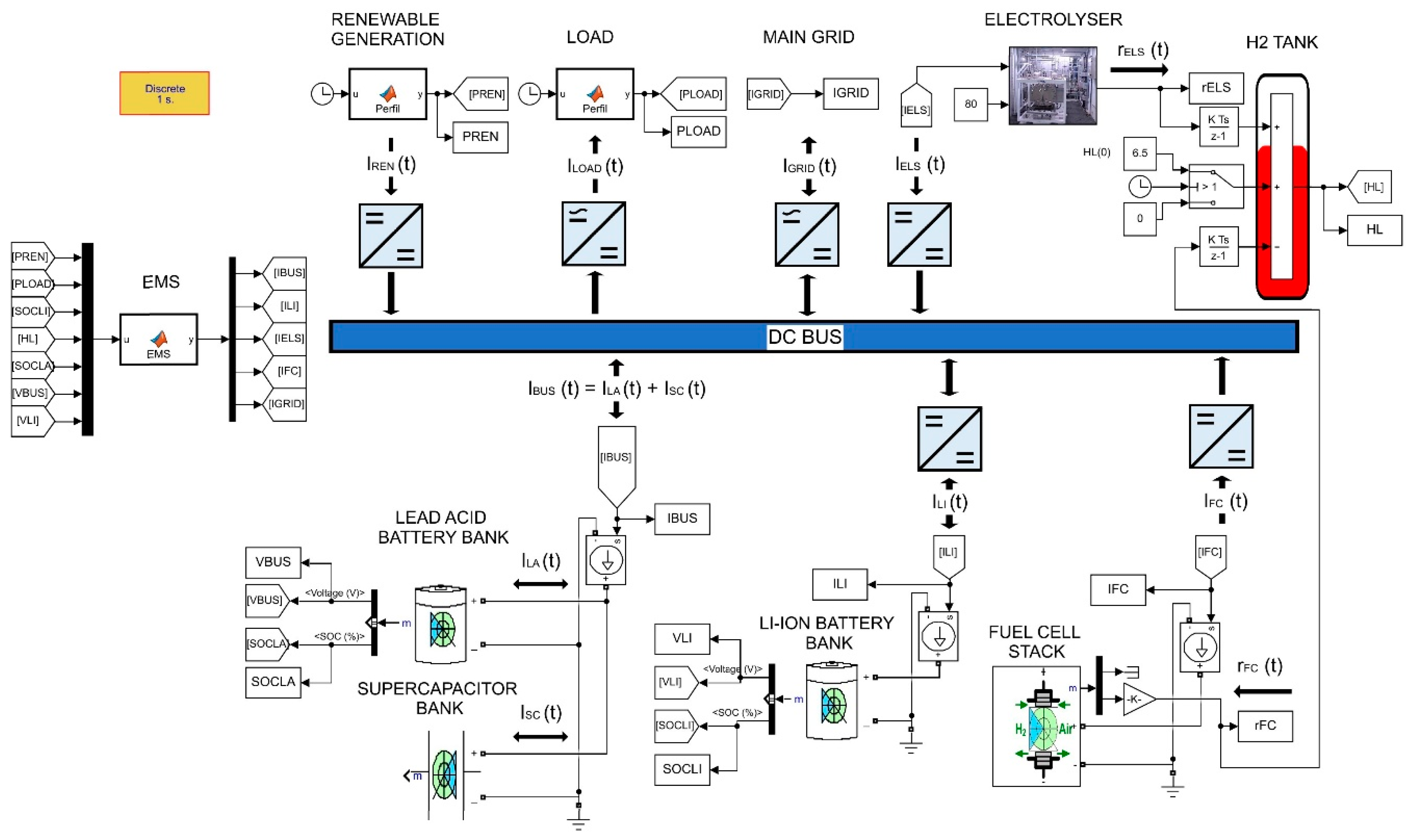 Architectures combining HBSS and SCB are presented in [48,49], where LTI models with SOC and HL as state variables are used for EMS for DC microgrids intended for power and hydrogen co-generation, commercialisation, and vehicle-to-home/home-to-vehicle (V2H/H2V) integration.