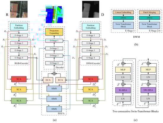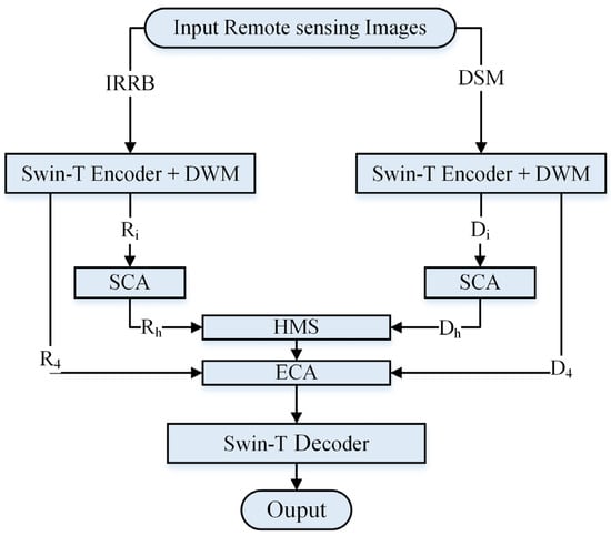 - Dual-branch Feature Extraction: the workflow starts with the input image and employs a parallel dual-branch architecture for multimodal feature encoding. Left branch: The IRRB image is processed using a Swin-T encoder integrated with DWM to extract the intermediate feature , which is then further refined through the SCA module to obtain . Right branch: The DSM image is processed using a unique Swin-T encoder integrated with the DWM to generate the intermediate feature , which is then refined with SCA to produce .