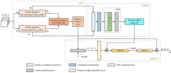 Among them, , , and represent the matrices of queries, keys, and values derived from the linear transformation of . This represents the dimension of the key vector, and B is the offset matrix generated by CRPB. Specifically, this module integrates the input window features with the learned position bias matrix and combines a dynamic window mechanism with continuous position encoding to achieve multi-scale adaptive attention.