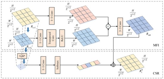 MFI builds a foundation for cross-scale feature fusion to connect high-level and low-level features. As shown in Figure 4, in the IRRB encoder, this sub-module connects features at different levels through a bidirectional feature propagation mechanism. Mathematically, the above can be expressed as: