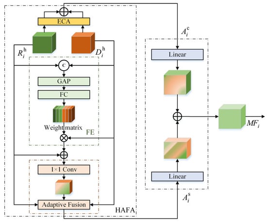 Due to the incomplete spatial alignment between DSM data and IRRB data during the spatial correlation calculation process, this study proposes a Heterogeneous Modality Synchronizer (HMS) to fuse heterogeneous information. As shown in Figure 6, this module consists of two components: spatial feature enhancement (FE) and adaptive channel fusion.