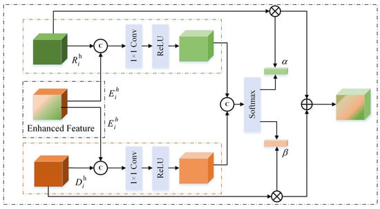 - The spatially enhanced features are first concatenated with and , respectively, followed by a convolutional layer to adjust channel dimensions and a ReLU activation for non-linearity;