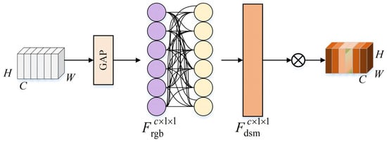 - Spatial Feature Enhancement (FE): firstly, process the multimodal data (including IRRB and DSM) through global average pooling (GAP) to extract spatial information. Then, input the aligned and fused features of IRRB and DSM into the adaptive fusion process, where the weight matrix is learned from the features of adjacent stages.