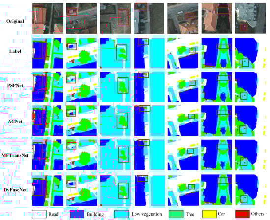 Experiments on the ISPRS Vaihingen and Potsdam datasets show that the method improves the segmentation accuracy of irregular features (such as building edges and road networks), enhances robustness in shadow and low-texture areas, maintains reliable classification in high-variance backgrounds, and achieves an optimal balance between accuracy and processing speed. These results collectively validate the effectiveness of the proposed DyFuseNet in complex remote sensing segmentation tasks.