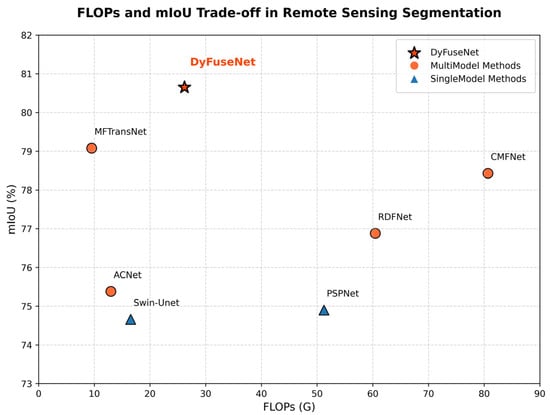 Extensive experiments on the Vaihingen and Potsdam datasets demonstrate that DyFuseNet achieves state-of-the-art performance, with mIoUs reaching 80.40% and 80.85%, which are 2.83% and 2.99% higher than the baseline model Swin-Trans, respectively, and 1.71% and 1.57% better than the sub-optimal model MFTransNet. Moreover, the model shows high segmentation accuracy in complex scenes, especially for the edges of large buildings and the shadow areas of small objects, with an average F1 score of up to 85%. Finally, DyFuseNet maintains low model complexity and computation efficiency while improving segmentation accuracy, with a FLOP count of only 26.19 G and achieving 30.09 FPS, indicating that the model is suitable for real-time deployment in practical applications.
