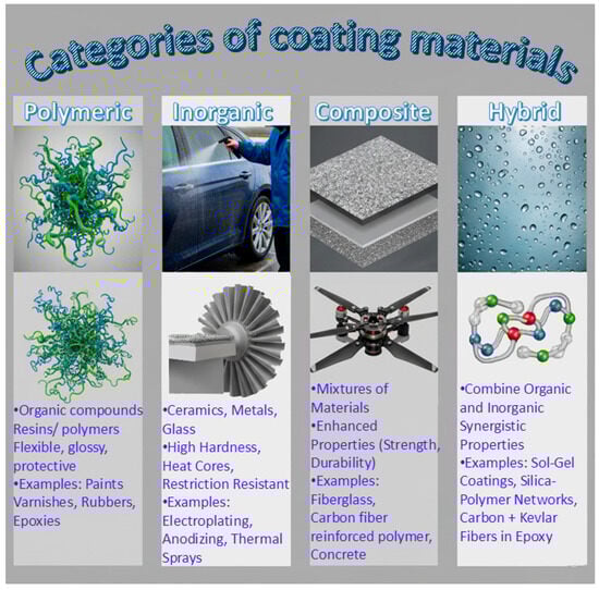 As mentioned before, surface coating materials can be divided into four categories based on the materials that are used (Figure 2): polymeric coatings, inorganic coatings, and composite coatings. The polymeric coatings are made from organic polymers, which provide flexibility and corrosion protection []. The inorganic coatings can offer durability against harsh environments and excellent heat resistance []. Finally, the composite coatings can provide many benefits, like enhanced strength and tailored functional properties. In advanced applications, these categories are often integrated to exploit synergistic effects, such as improved electrochemical stability, superior adhesion to metallic substrates, and enhanced barrier properties. The selection of the appropriate coating system is governed by parameters including substrate–coating interfacial chemistry, microstructural characteristics, and long-term degradation mechanisms. Recent research efforts are increasingly focused on nanostructured and multifunctional coatings that can simultaneously provide corrosion resistance, self-healing capability, and environmental sustainability [].