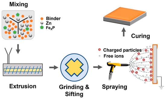 Schematic representation of the powder coatings fabrication process containing iron phosphide, reproduced with permission [].