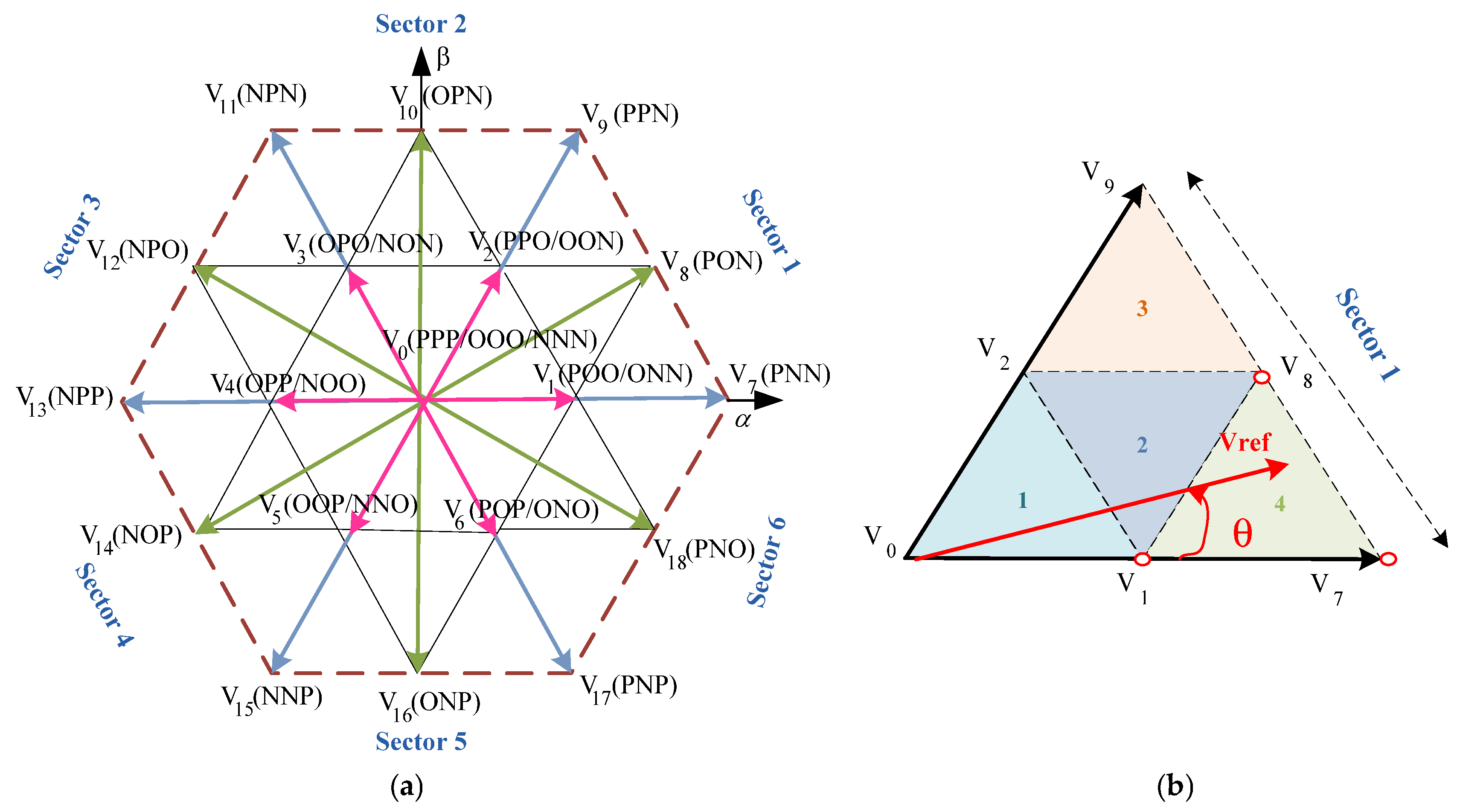 - Mahmoud, Z.; Hamouda, M.; Khedher, A. A comparative study between the nearest three vectors and two-level hexagons based space vector modulation algorithms for three-level NPC inverters. Int. J. Renew. Energy Res. 2017, 7, 1074–1084. [Google Scholar]