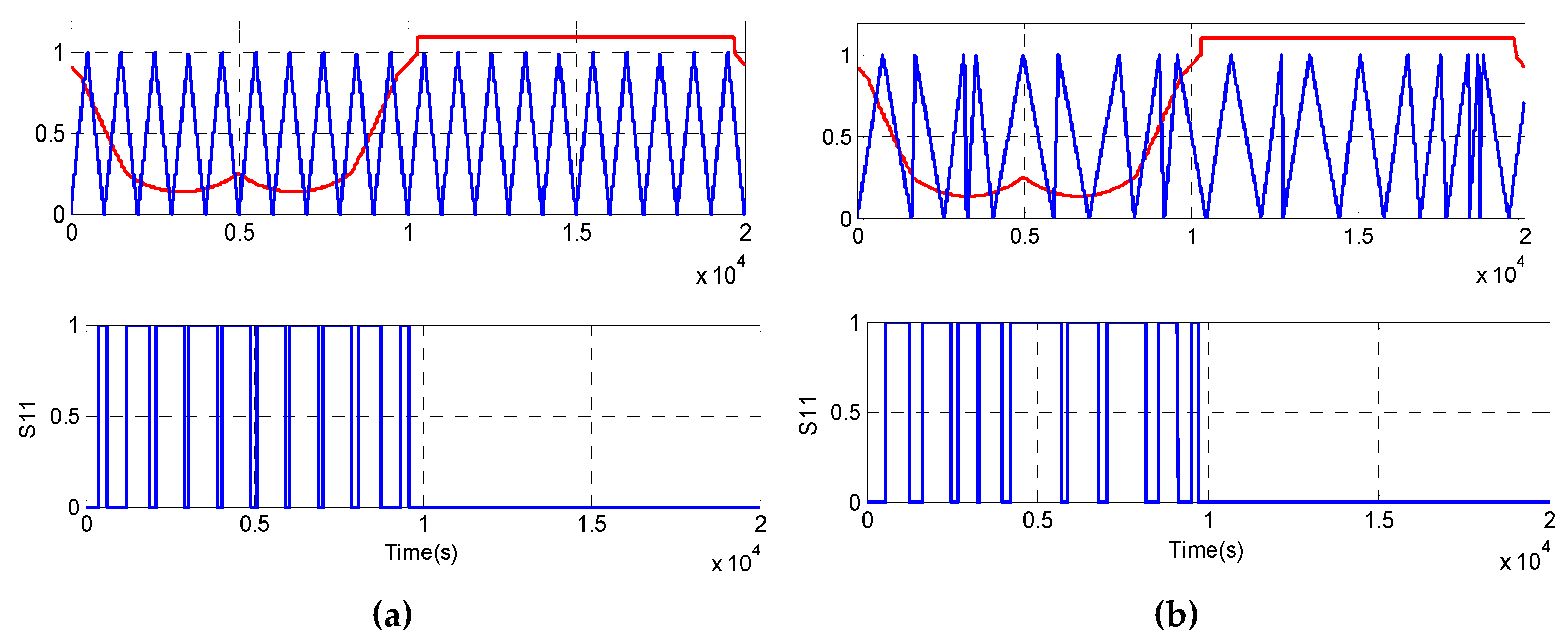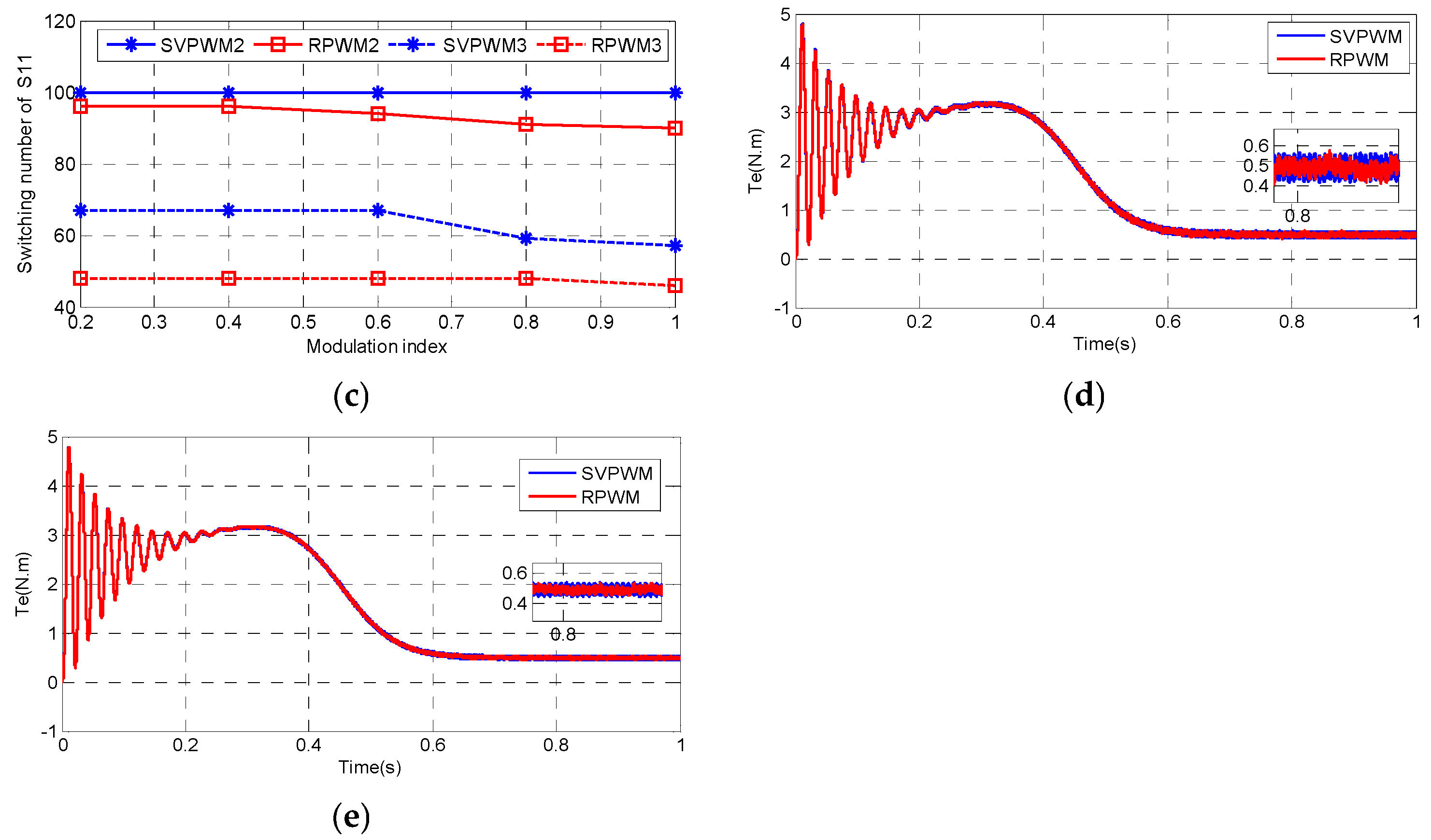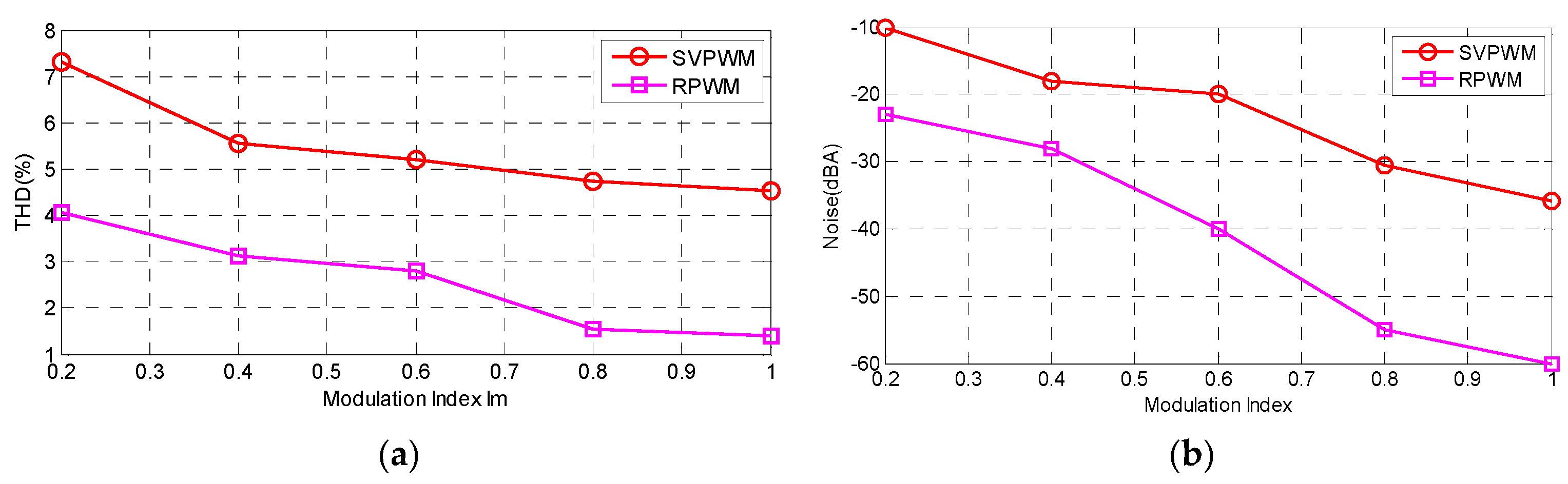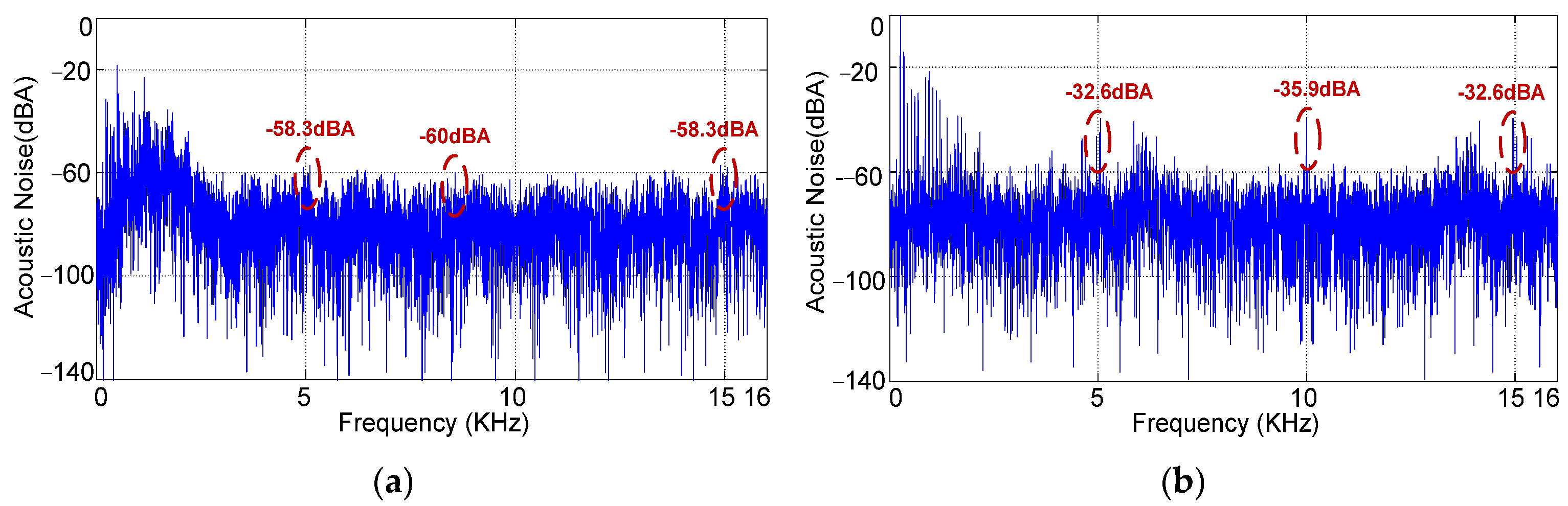 - Huang, Y.; Xu, Y.; Zhang, W.; Zou, J. Hybrid RPWM technique based on modified SVPWM to reduce the PWM acoustic noise. IEEE Trans. Power Electron. 2018, 34, 5667–5674. [Google Scholar] [CrossRef]