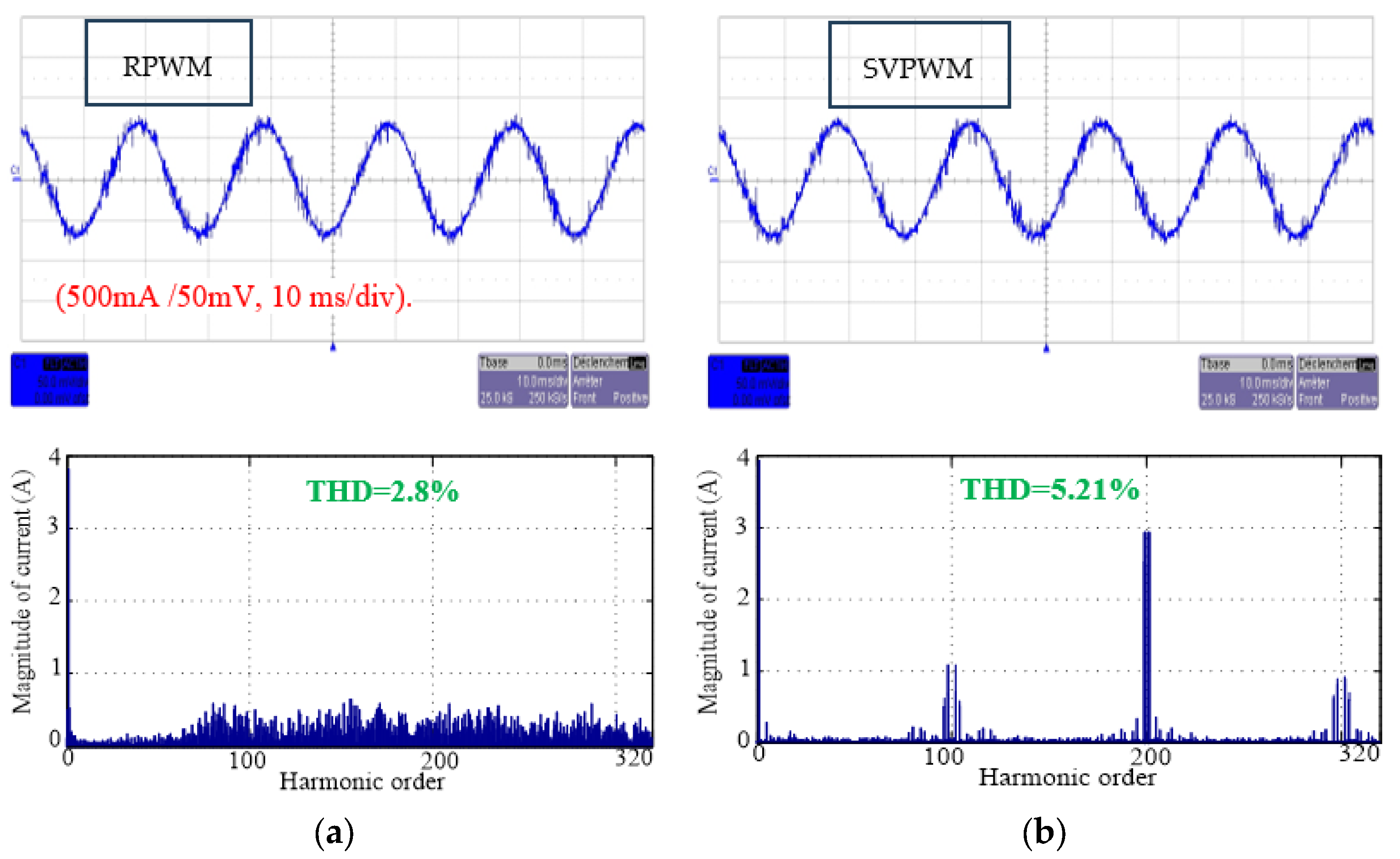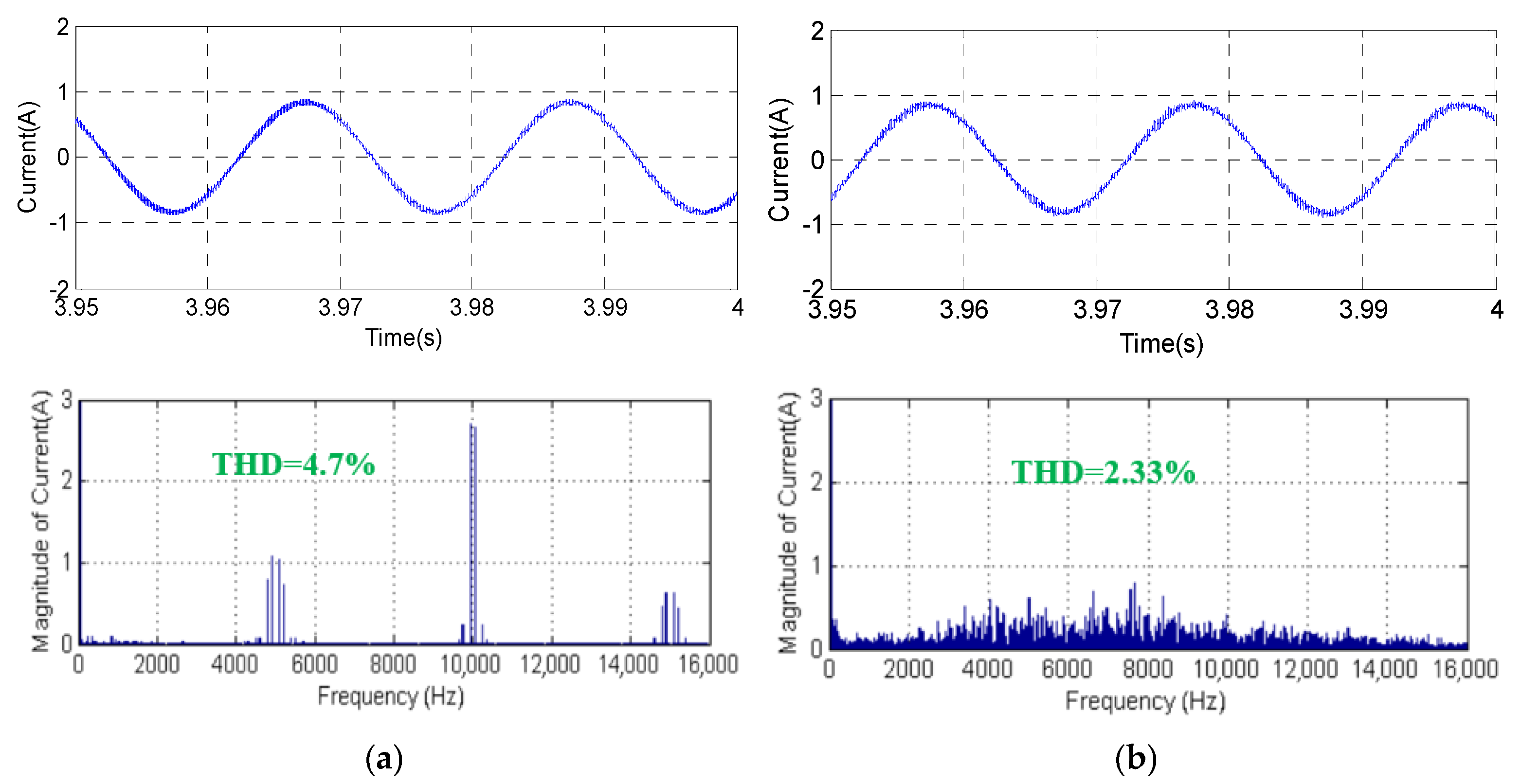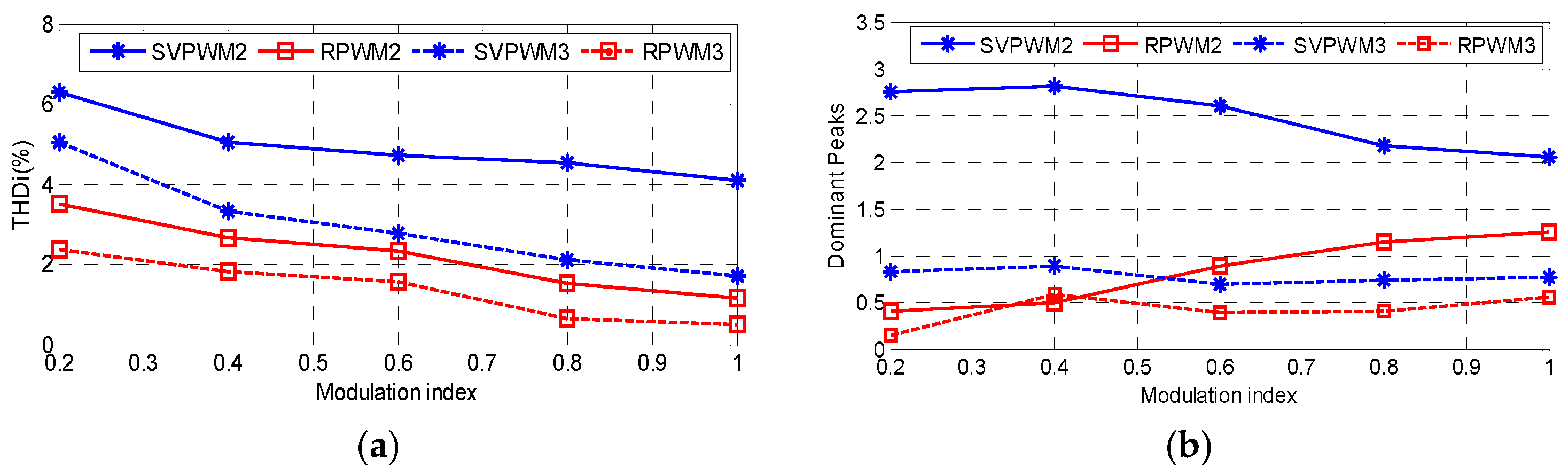 - Xu, J.; Ouyang, Z.; Sun, J.; Zhu, W.; Nie, Z. Performance and Characterization of Optimal Harmonic Dispersion Effect in Double Frequency Band Random PWM Strategy. IEEE Trans. Power Electron. 2024, 39, 14680–14690. [Google Scholar] [CrossRef]