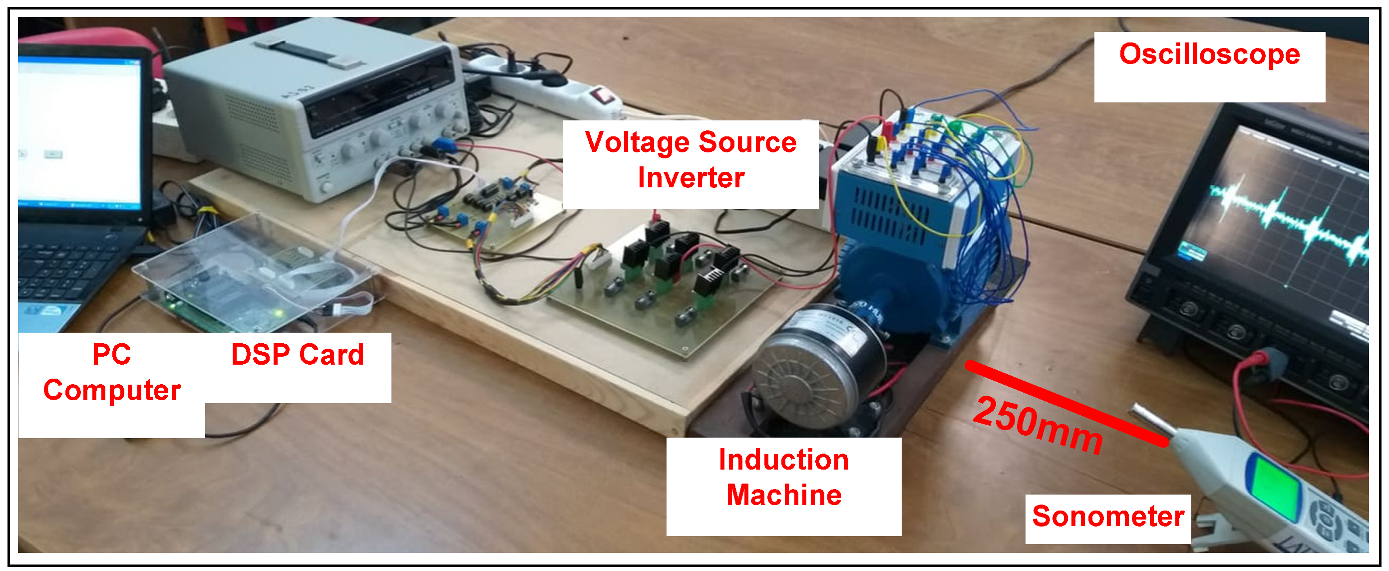 - Bouyahi, H.; Khedher, A. Acoustic noise of induction motor drive with Voltage-Source Inverter by Random Space Vector PWM: Simulation and Experimentation analysis. J. Appl. Sci. 2025, 15, 4646. [Google Scholar]