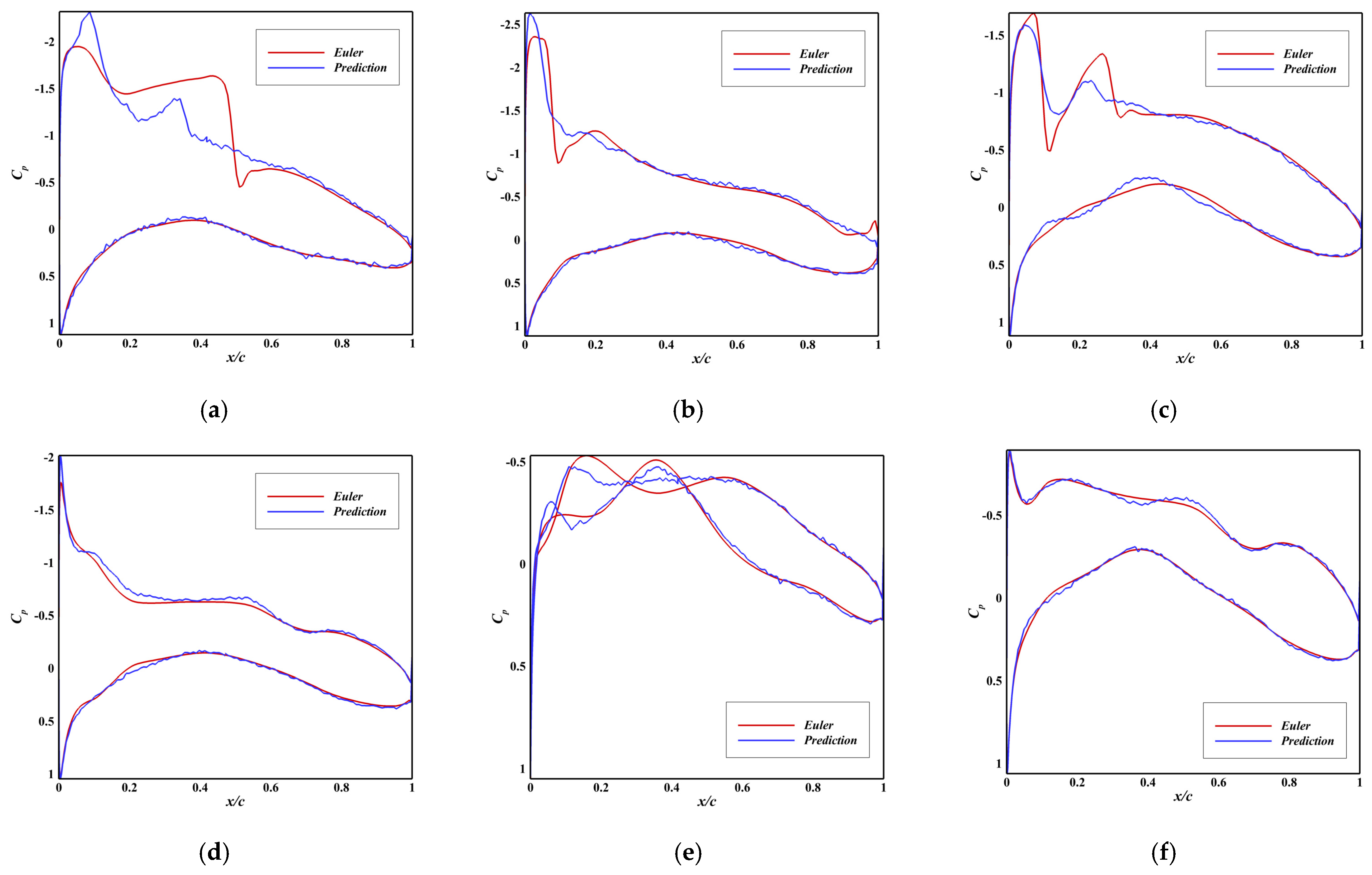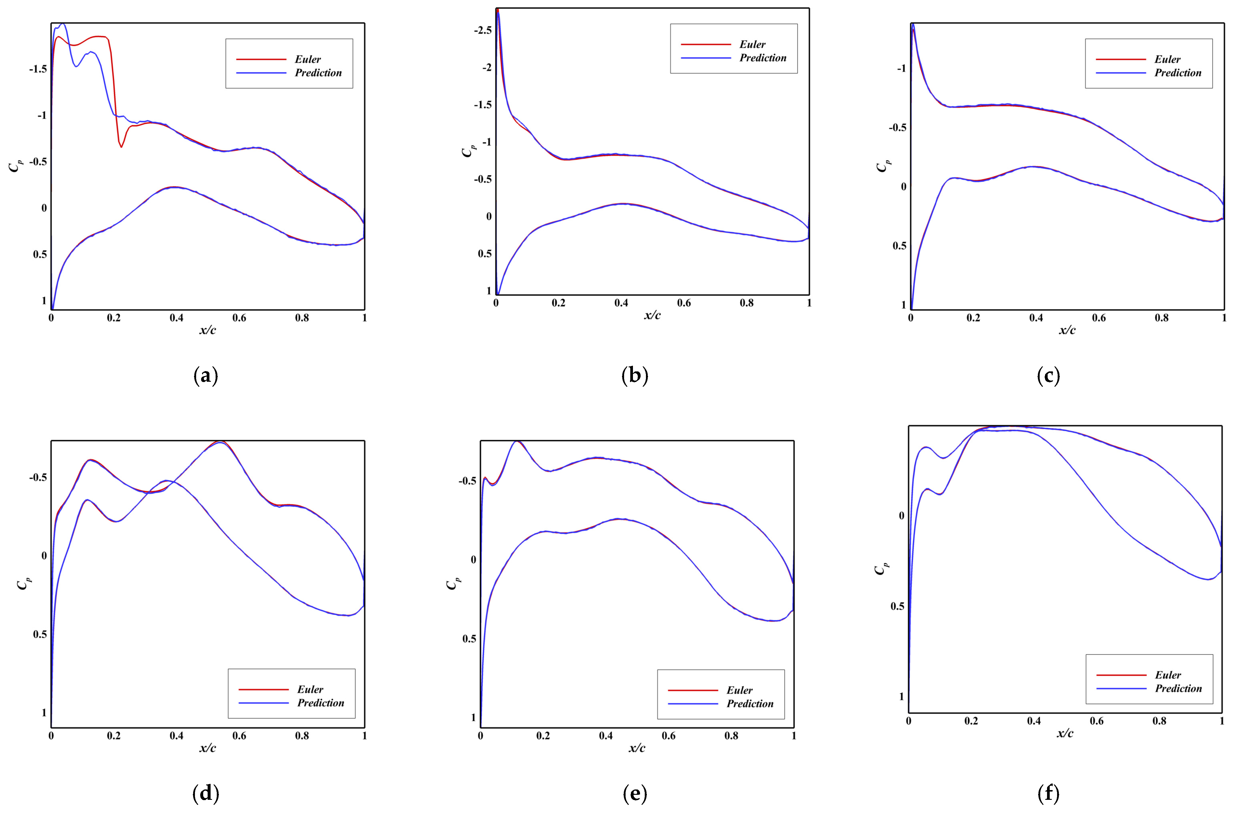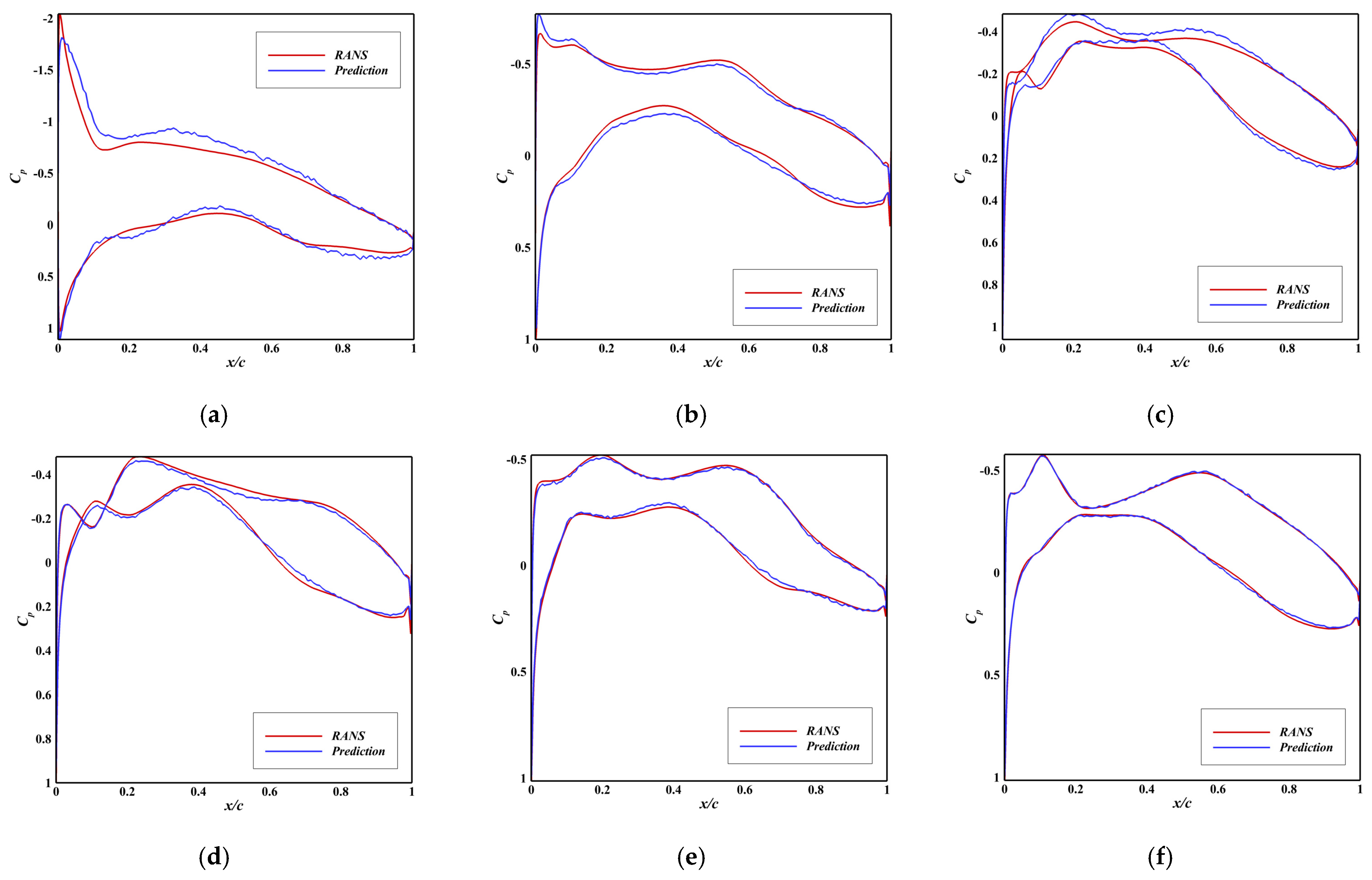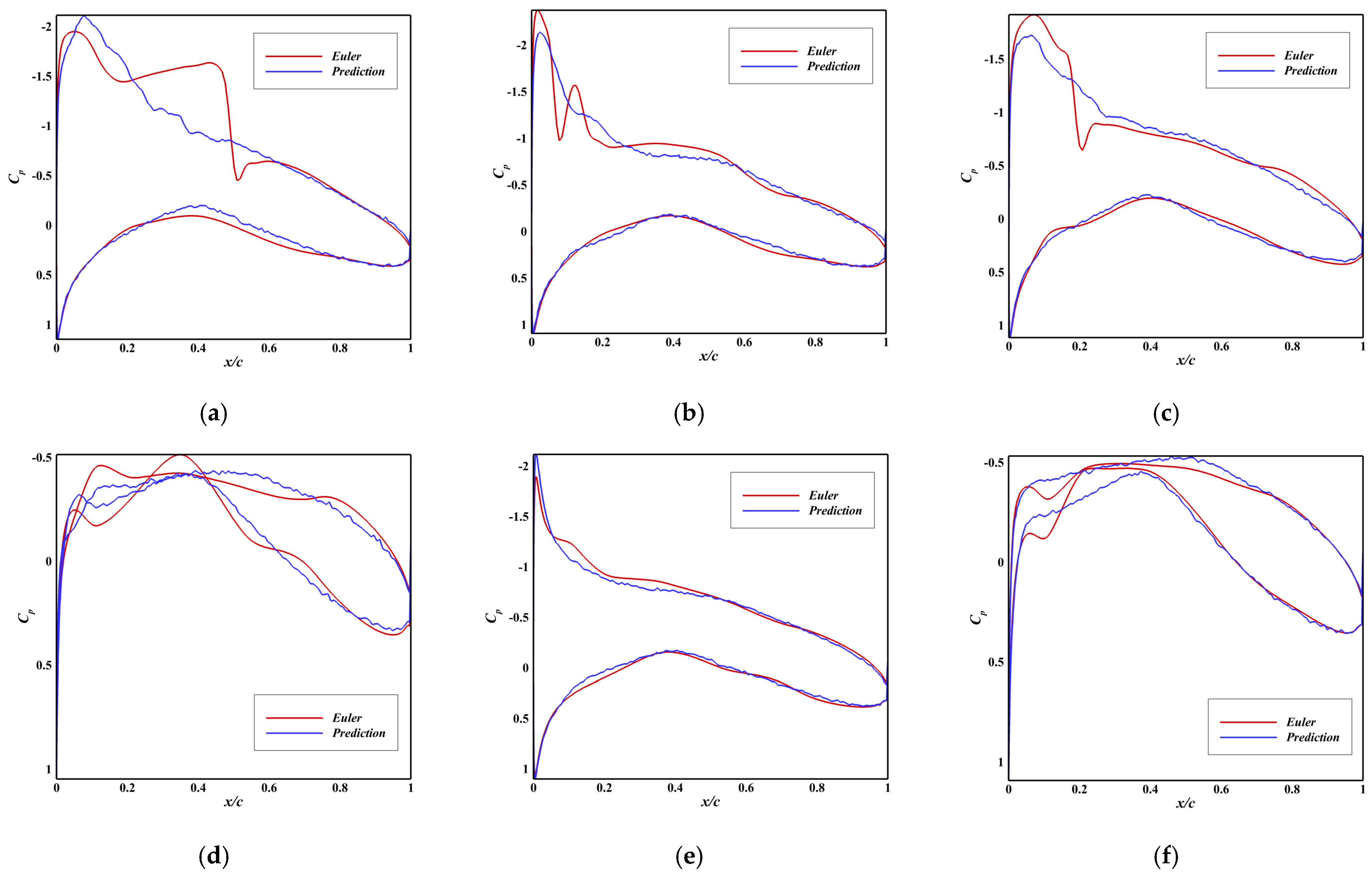 Comparison between Predicted and Ground Truth Pressure Distributions of Model E1. (a) RMSE = 0.281, Ma = 0.39, AoA = 3.8°; (b) RMSE = 0.187, Ma = 0.11, AoA = 1.3°; (c) RMSE = 0.163, Ma = 0.39, AoA = −0.2°; (d) RMSE = 0.139, Ma = 0.15, AoA = −0.4°; (e) RMSE = 0.115, Ma = 0.26, AoA = 0.7°; (f) RMSE = 0.089, Ma = 0.27, AoA = 0.3°.