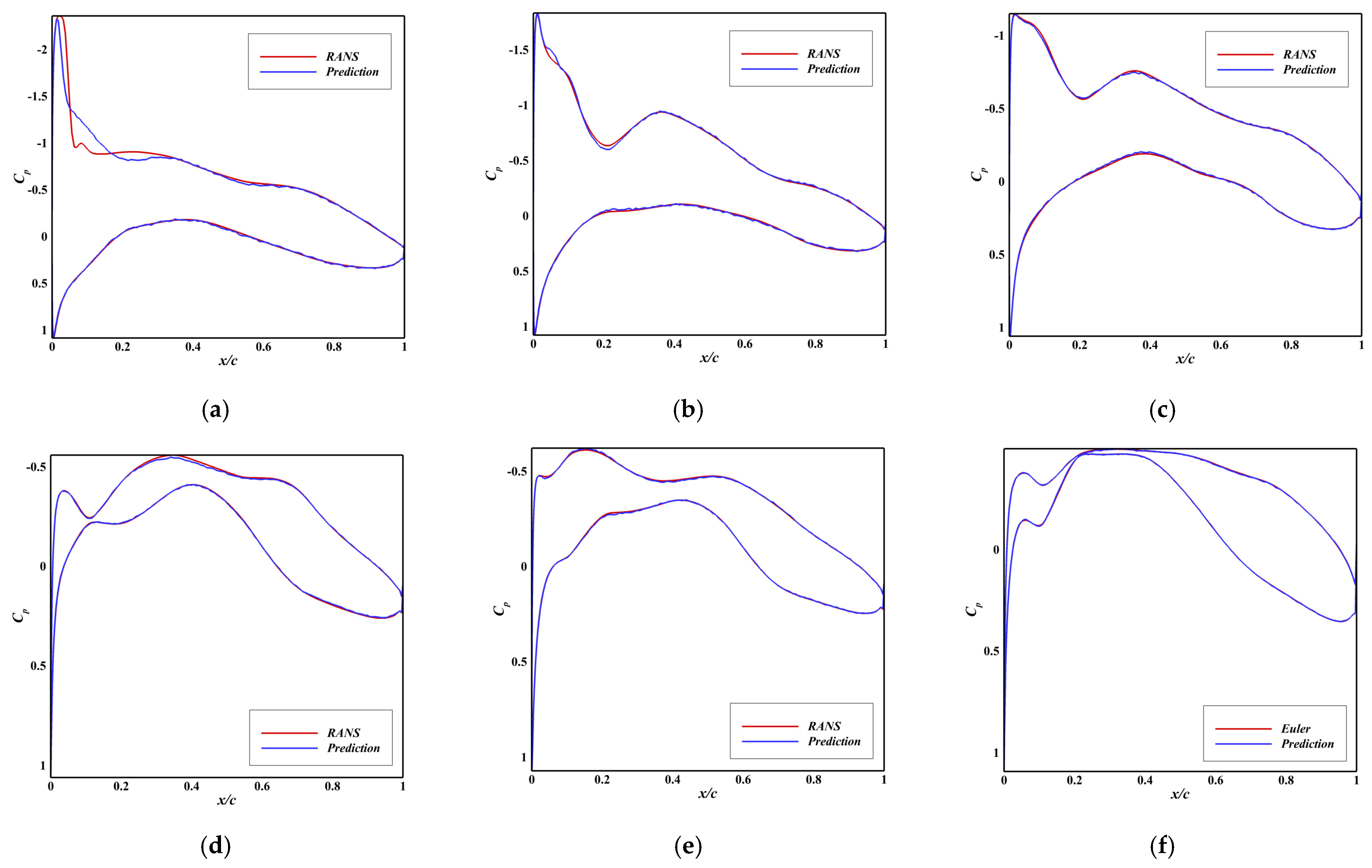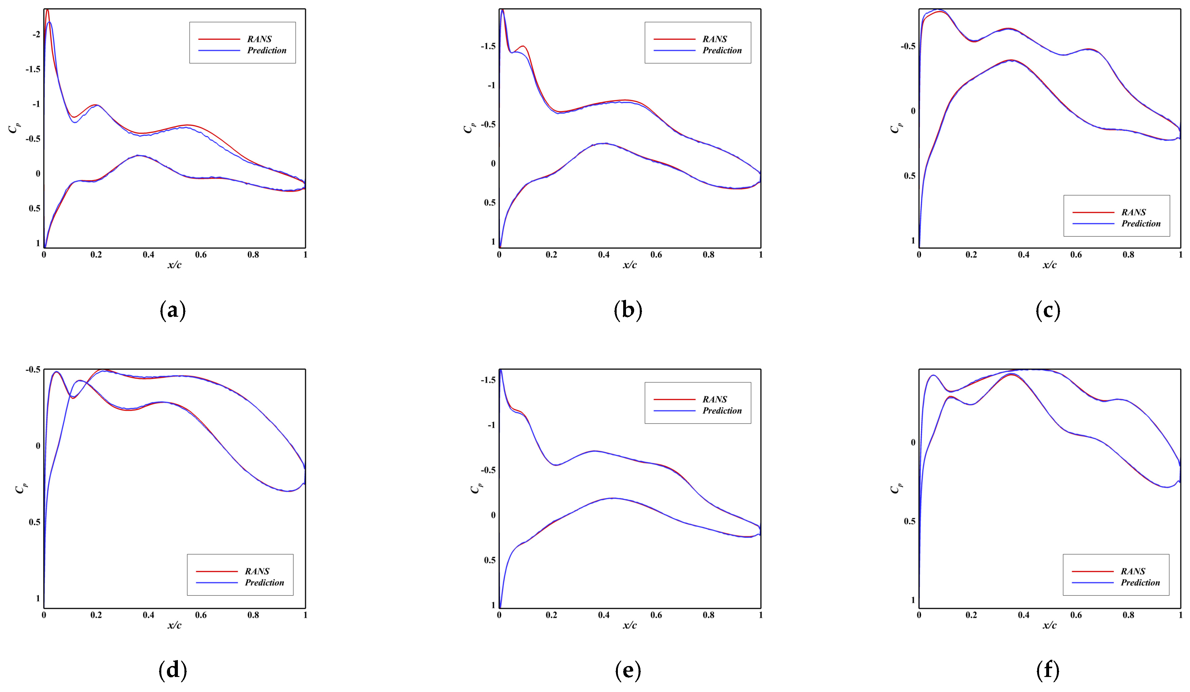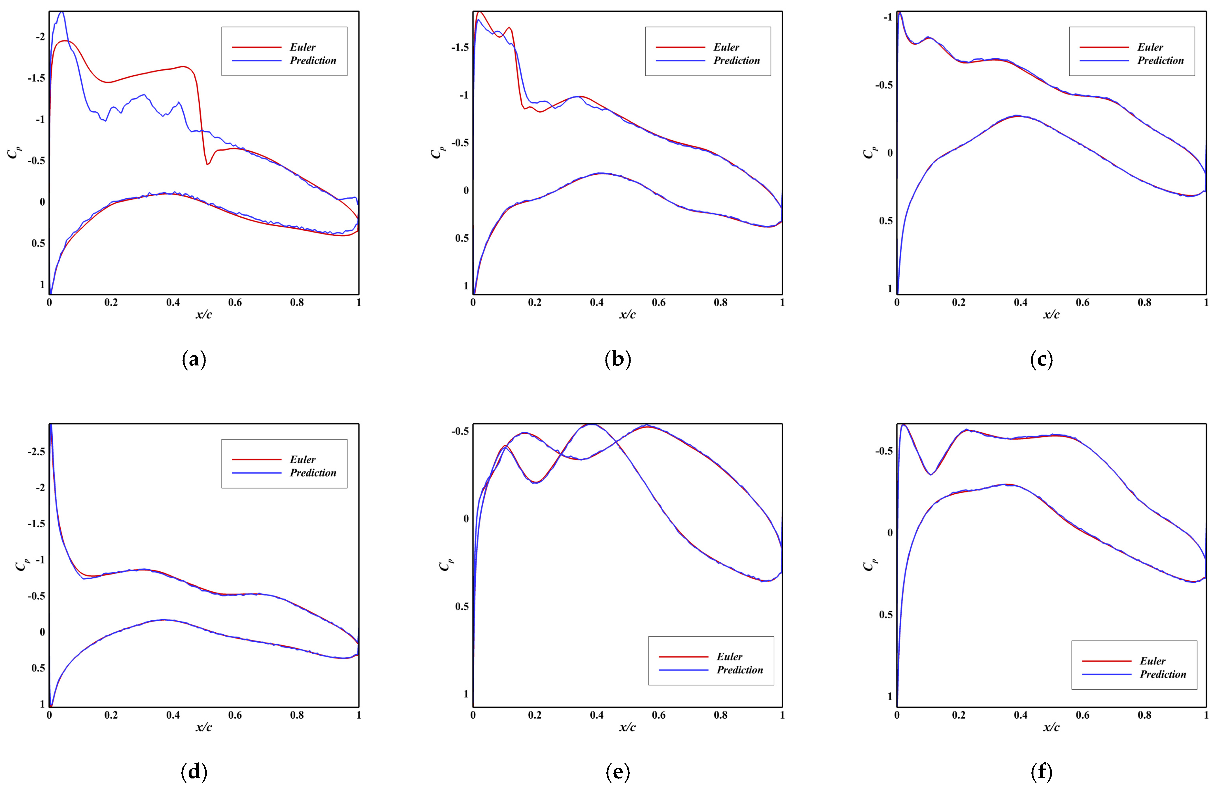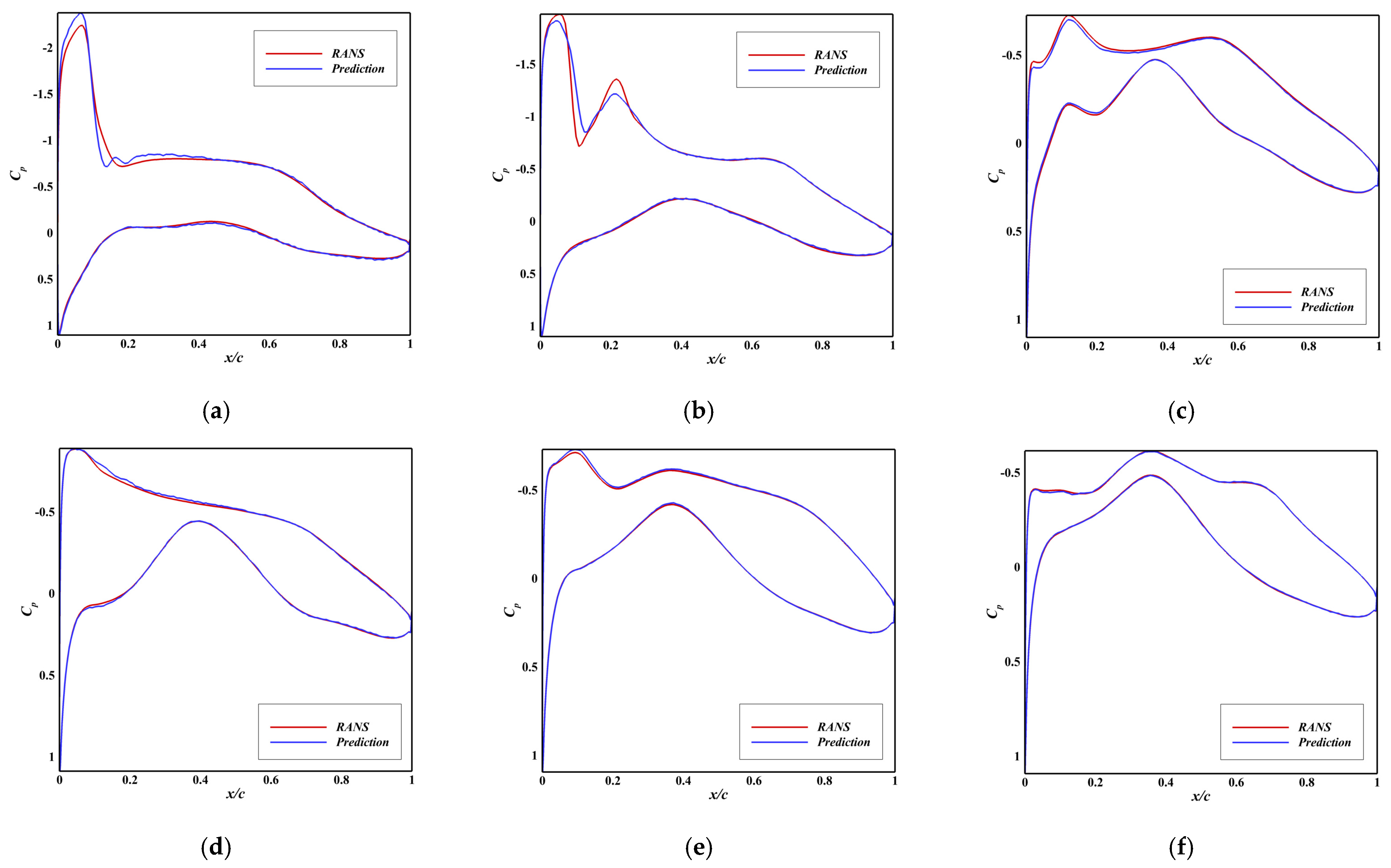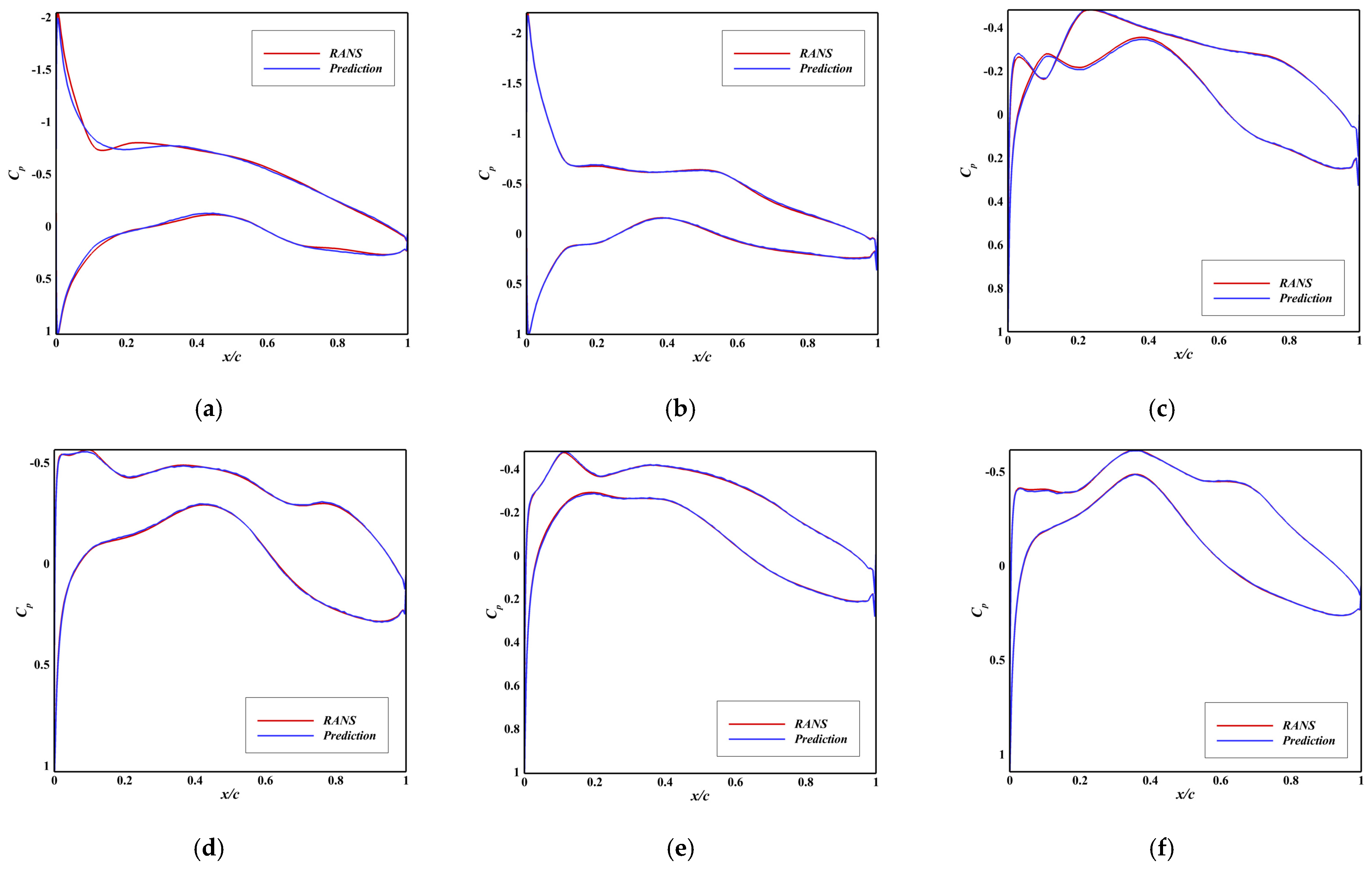 Comparison between Predicted and Ground Truth Pressure Distributions of Model E1. (a) RMSE = 0.281, Ma = 0.39, AoA = 3.8°; (b) RMSE = 0.187, Ma = 0.11, AoA = 1.3°; (c) RMSE = 0.163, Ma = 0.39, AoA = −0.2°; (d) RMSE = 0.139, Ma = 0.15, AoA = −0.4°; (e) RMSE = 0.115, Ma = 0.26, AoA = 0.7°; (f) RMSE = 0.089, Ma = 0.27, AoA = 0.3°.