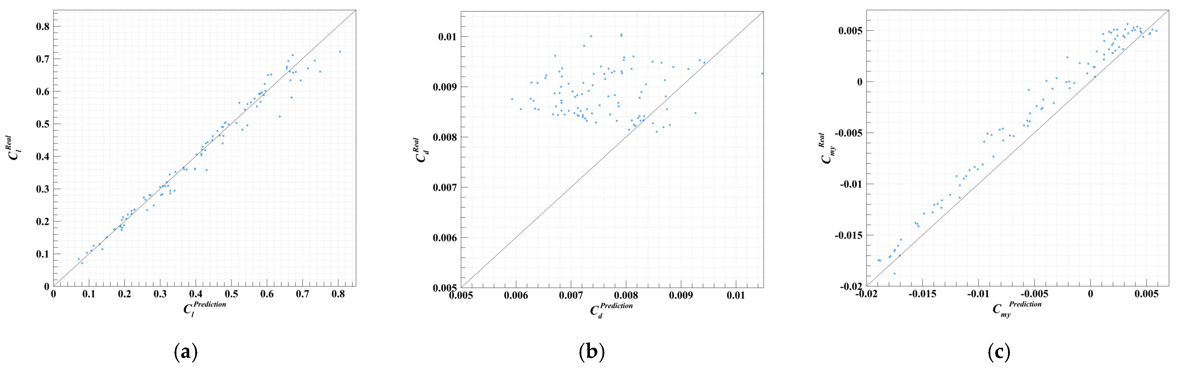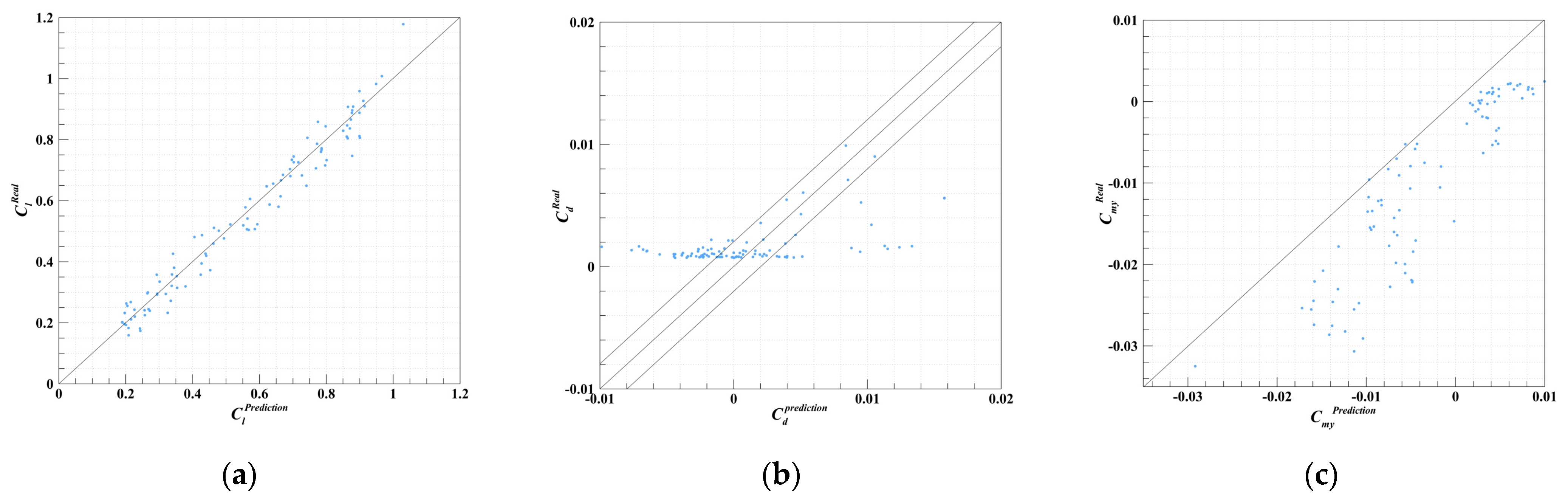 p) exhibited considerable deviation from the Euler solutions, with Root Mean Square Error (RMSE) values consistently around 0.2–0.35. More critically, its predictive capability for force coefficients was virtually non-existent for drag (C