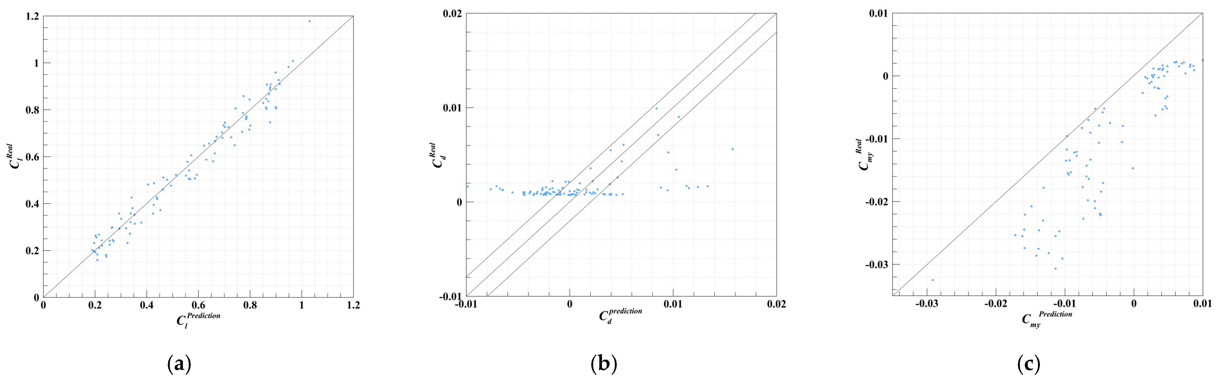 Scatter Plot of Force Coefficient Correlation for Model E1. (a) Correlation Diagram for Lift Coefficient, R2 = 0.973. (b) Correlation Diagram for Drag Coefficient, R2 = −11.3. (c) Correlation Diagram for Moment Coefficient, R2 = 0.932.