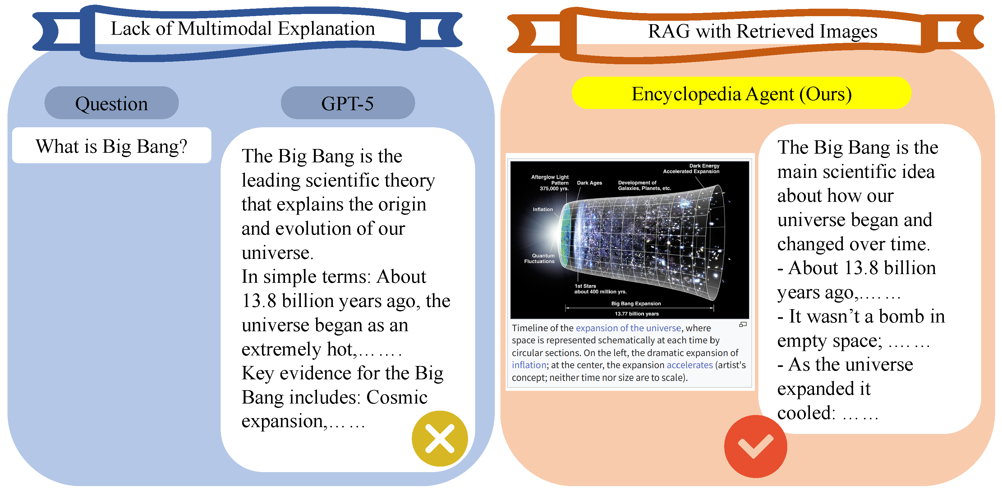 - We design an Encyclopedia Agent that combines document retrieval, RAG-based answer generation, and interactive multimodal explanation. This framework highlights the scalability of our approach and its potential applicability to diverse educational domains, such as science, history, and arts.