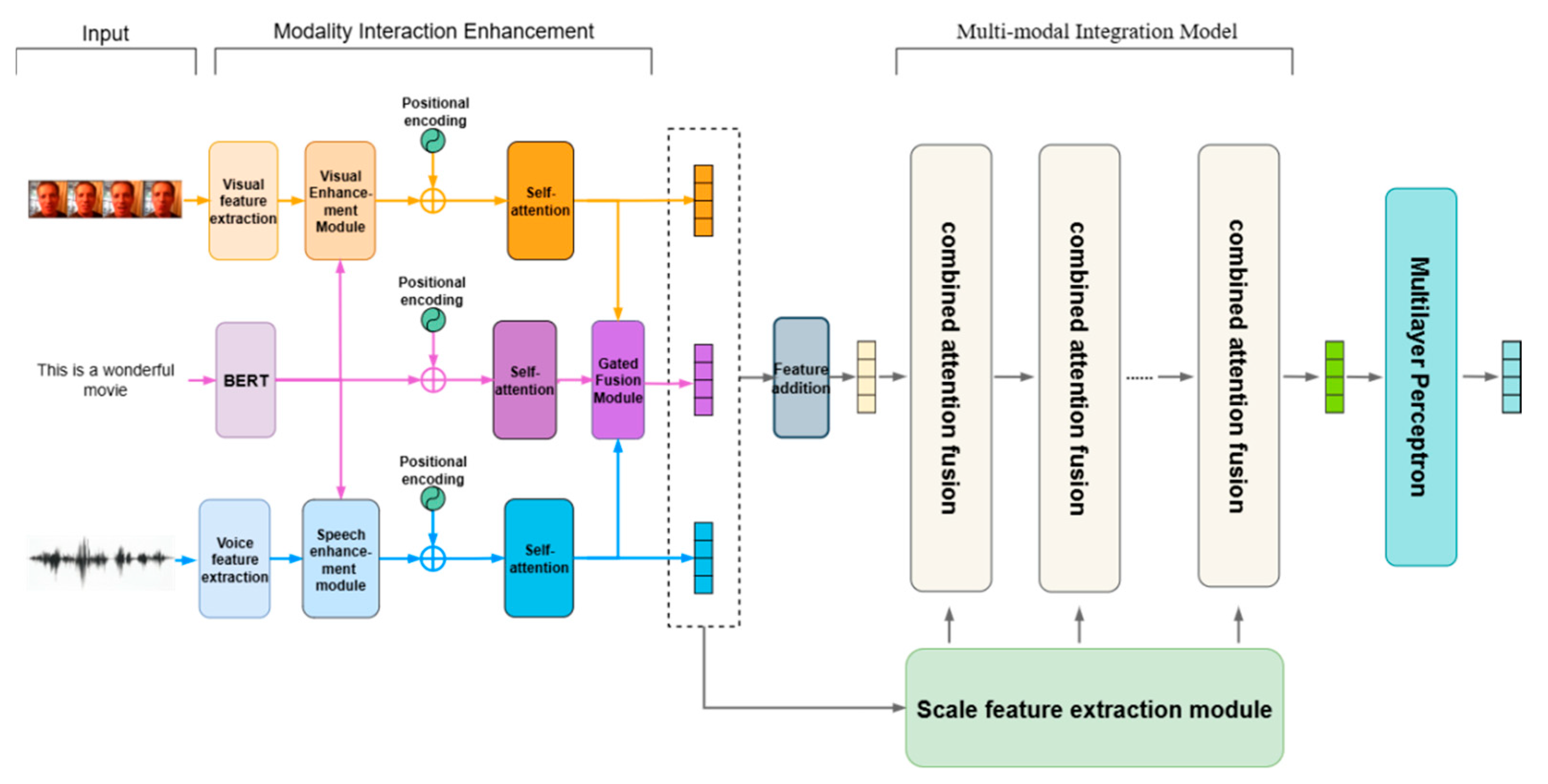 Finally, a combined attention fusion module is constructed and integrated with a multiscale encoder to capture cross-modal semantic interactions at both global and local levels, leading to more robust and efficient sentiment recognition.