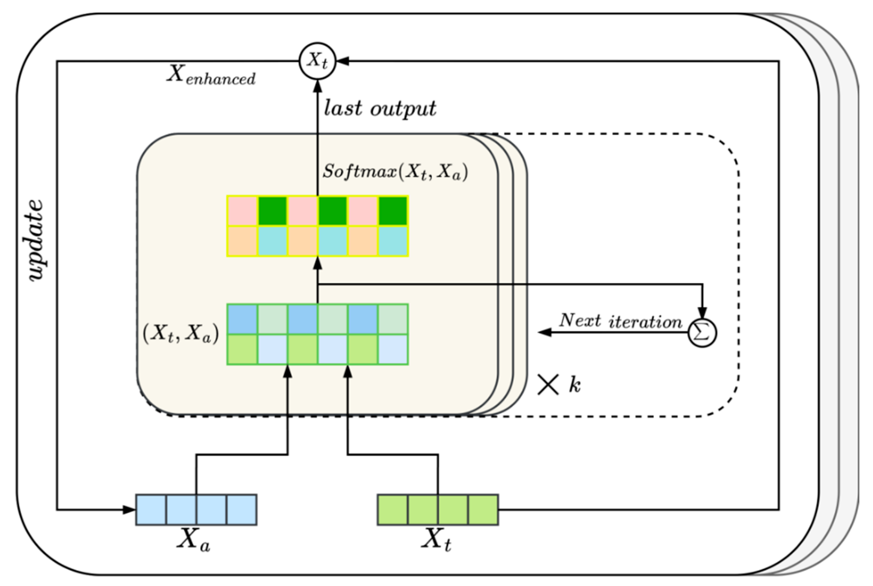 Then, the softmax function is used to obtain the attention weight, which is multiplied by to perform a weighted summation, and the result is the enhanced speech feature for the current -th iteration. When there is no historical modality similarity value, so is the original speech modality, that is .