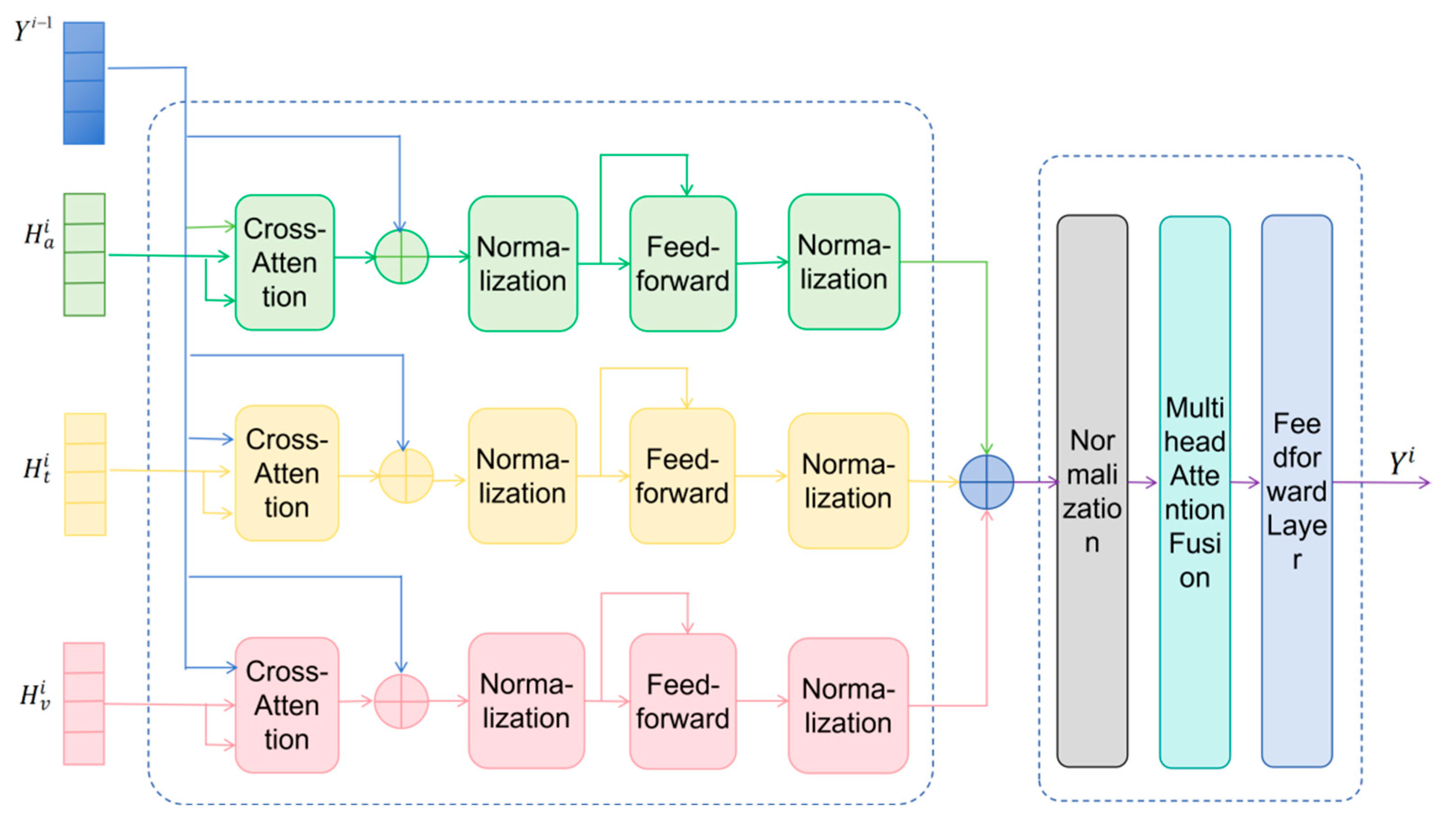 are the results of the i-th layer’s cross-attention calculation, and the summation term is the result of the cross-attention calculation followed by two layers of normalization. LayerNorm and FFN represent layer normalization and a feed-forward layer, respectively. is the final output of the i-th layer of the combined attention fusion module.