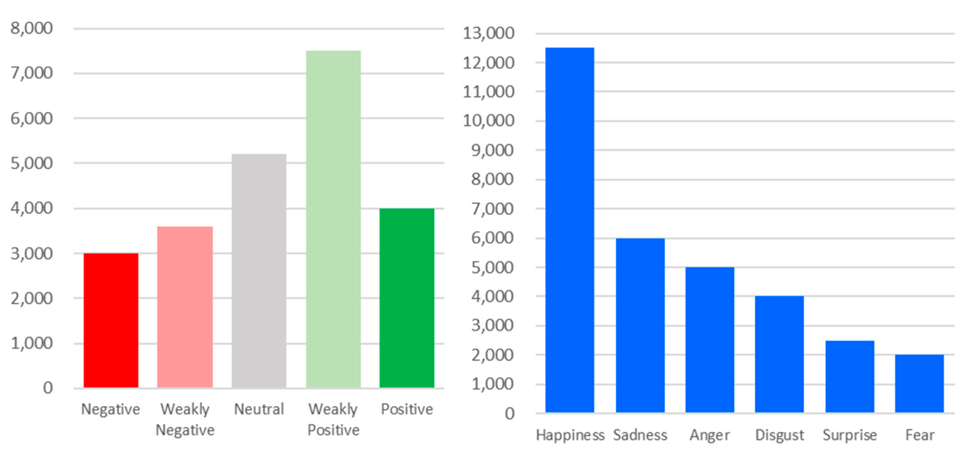 Figure 5, the CMU-MOSEI annotation system includes two dimensions: sentiment polarity and emotional intensity. Sentiment polarity is represented by a continuous value from −3 to +3, from extremely negative to extremely positive. For better interpretability, these values are grouped into five categories: Negative (−3, −2), Weakly Negative (−1), Neutral (0), Weakly Positive (+1), and Positive (+2, +3). Emotional intensity is annotated for six basic emotions (anger, disgust, fear, happiness, sadness, and surprise), with a focus on gender balance.