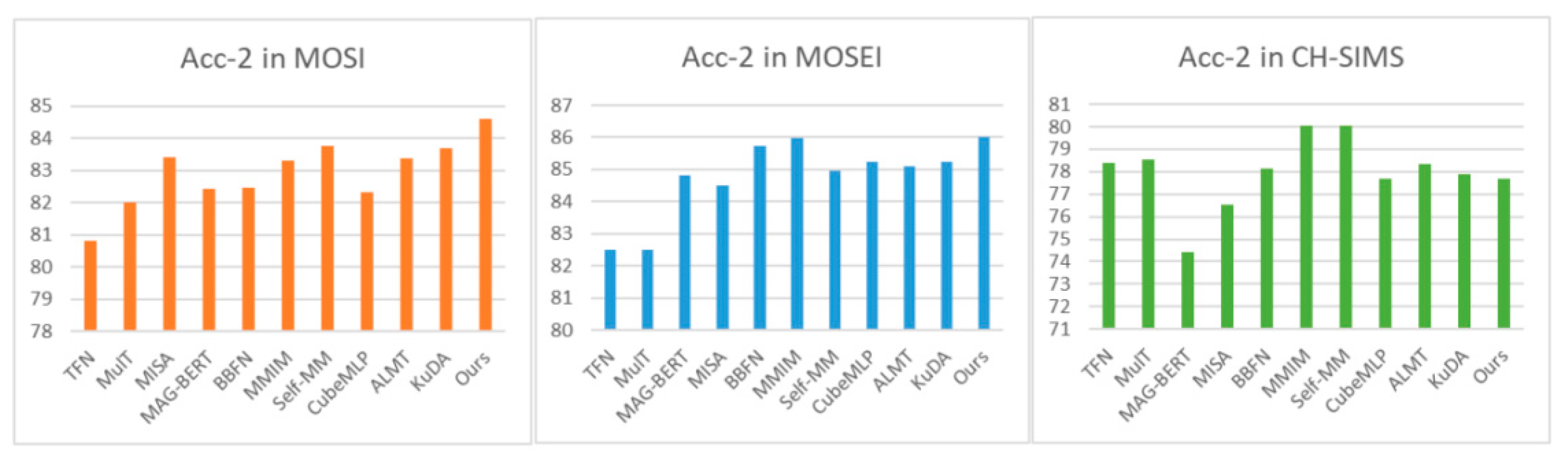 Figure 6 shows the Non0-Acc2 scores of the different models. Compared to earlier methods like TFN, MulT, and MAG-BERT, the advantage of the proposed model lies primarily in its enhanced modality interaction capability. While TFN created a unified representation space for multimodal interaction, its static fusion strategy cannot adapt to the changing importance of modalities in different samples. MulT introduced a cross-modal attention mechanism to solve the modality misalignment problem, but its directional cross-attention structure limited comprehensive interaction between modalities. MAG-BERT incorporated non-verbal information through a multimodal adaptive gating mechanism, but its excessive reliance on the text modality led to insufficient robustness. On CH-SIMS, its Corr was only 0.399, while the proposed model achieved 0.594. In contrast, the proposed model, through its modality enhancement and multimodal integrated fusion attention framework, achieves more comprehensive and adaptive modality interaction.
