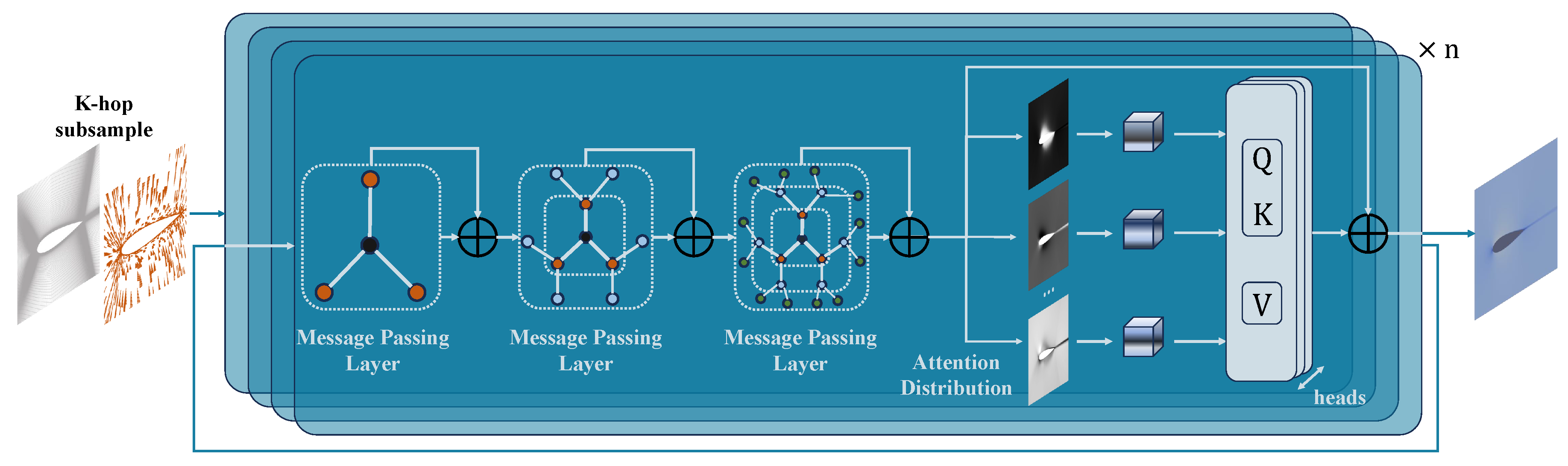 Various network models in deep learning are applied to flow field modeling, such as Convolution Neural Network (CNN) [1,2,3,4,5,6,7] and Graph Neural Network (GNN) [8,9,10,11,12,13,14]. Yu et al. used a knowledge-enhanced end-to-end CNN as the core, and replaced the high-cost numerical calculation of unsteady flow around blunt bodies with near-real-time pixel-to-pixel prediction through wind engineering priors such as non-uniform encryption and transfer learning [15]. Lee et al. used CNNs with four progressive resolutions and physical conservation constraints to achieve fast prediction of three-dimensional cylindrical wakes [16]. Du et al. builds an integrated CNN-based pipeline that unifies airfoil parameterization, flow prediction, and rapid inverse design [17]. Pfaff et al. proposed MeshGraphNet, which combines multi-space message passing with a learnable adaptive re-meshing mechanism [18]. Li et al. achieved fast and high-precision prediction of two-dimensional unsteady incompressible flows on unstructured grids by embedding finite volume constraints into losses and combining two-level message aggregation with spatial integration layers, significantly suppressing error accumulation and accelerating training and inference [19]. Zou et al. combine finite difference residual with graph to make a differentiable GC-FDM. Combined with block-level coordinate transformation and unit-enhanced message passing, it realizes label-free, physically constrained flow field solution on multi-block conforming grids [20].