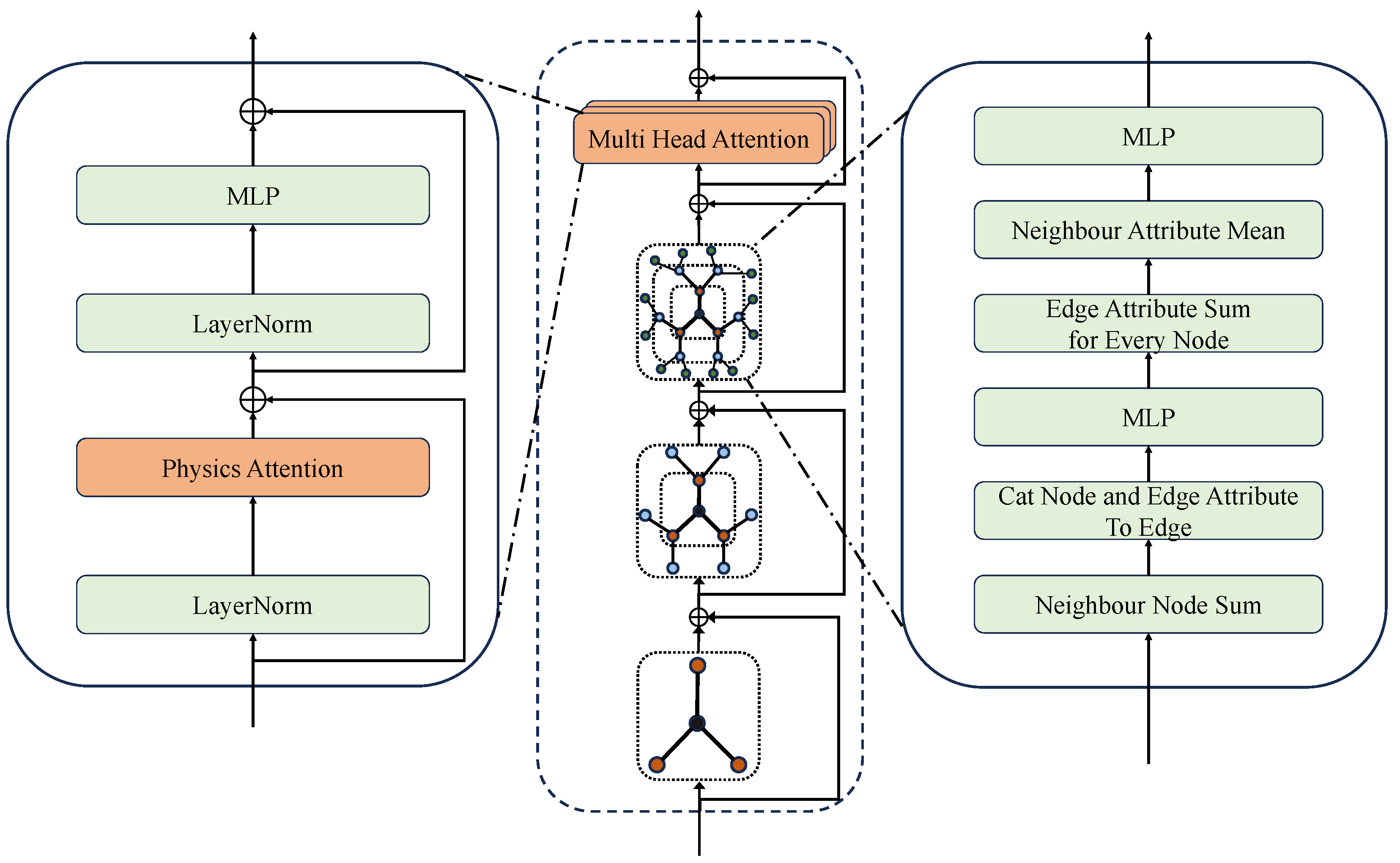 The Transformer architecture [26] has gained prominence due to its exceptional natural language processing capabilities [27,28,29]. Based on this architecture and its core component attention mechanism, Wu et al. used learnable physical slices and Physics-Attention to transfer the multi-head attention of Transformer from massive grid points to physical tokens, achieving high-precision, linear-time solution of PDE in arbitrarily complex geometric domains [30]. Luo et al. extended Transolver, enables the first success in accurately solving PDEs discretized on million-scale geometries [31]. Zhou et al. utilize complete PDE component and decoupled conditional Transformer to explicitly inject equation knowledge into the network, achieving strong generalization and state-of-the-art (SOTA) performance under multiple data sets, multiple equations, and multiple boundary conditions [32]. Xiao et al. combined geometric attention with implicit neural fields, and efficiently encoded the geometric information of irregular point clouds [33]. Alki et al. proposed a unified neural operator framework that does not rely on a specific grid or particle structure [34].