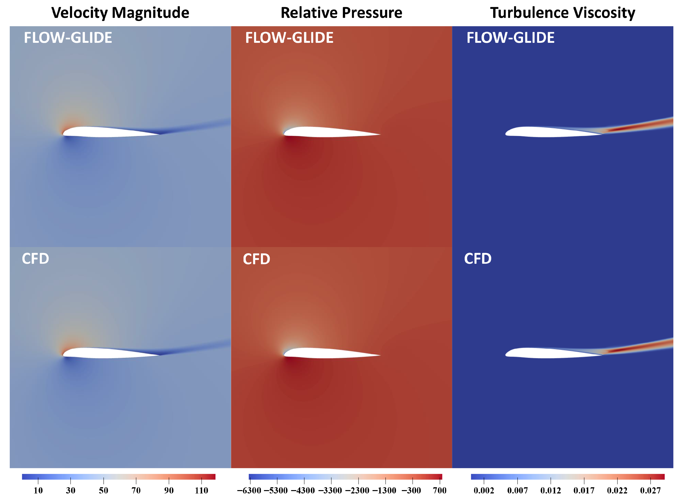 Figure 3 shows that FLOW-GLIDE reproduces the spatial organization of the two-dimensional flow with high fidelity. Locally, the leading-edge stagnation region and the near-wall acceleration along the suction side agree closely with the CFD reference. Globally, the growth of the boundary layer and the downstream development of the wake are consistently reproduced.