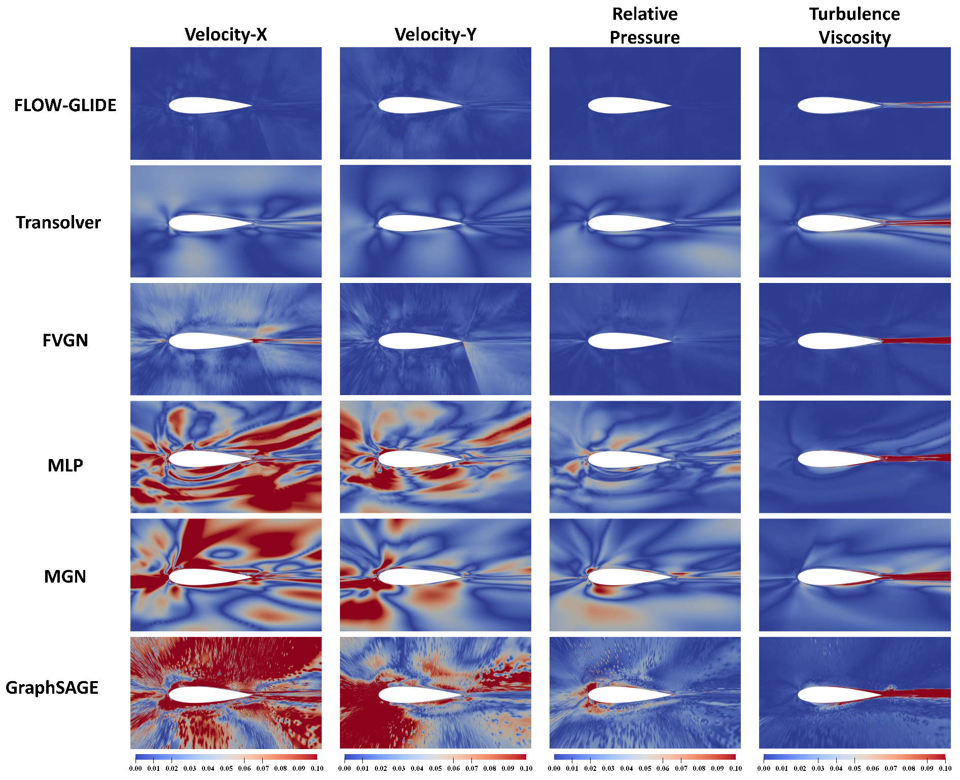 The baseline models used in AirfRANS include MLP, Graph U-Net [25], GraphSAGE [40], and PointNet [41]. For visualization comparison with FLOW-GLIDE, we additionally re-implement FVGN [19], MeshGraphNet [18], Transolver [30], together with MLP and GraphSAGE [40]. All these models were trained for 600 epochs using an initial learning rate of 0.001 and the ADAM optimizer with a latent space of feature length 128. The relative L2 loss function was used. In one MAG-BLOCK, three Message Passing layers and one attention layer are used. Additional comparisons are conducted with newer models, including GNO [42], GNOT [43], GINO [44], and Galerkin [45]. All experiments were conducted on an RTX 4090 GPU and the code was implemented using the PyTorch framework.