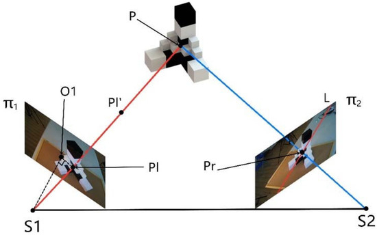 Close-range photogrammetry is a three-dimensional reconstruction method based on camera imaging principles [17]. As illustrated in Figure 4, the principle of ray intersection serves as the foundation for computing object-space coordinates [18]. By performing back intersection using known control points, the camera’s spatial position and orientation can be recovered to obtain the exterior orientation elements [19,20]. Subsequently, corresponding image points are identified across multiple images, their image-plane coordinates are extracted, and the imaging ray directions are reconstructed based on geometric relationships [21]. By exploiting the reversibility of light rays, multi-view rays are back-projected and intersected to obtain the three-dimensional coordinates of object points, thereby achieving reconstruction from two-dimensional images to a three-dimensional real scene [22]. In this study, this method is employed to extract panel contours and hole features, offering high accuracy, flexible deployment, and strong adaptability, and providing a reliable data foundation for subsequent identification.