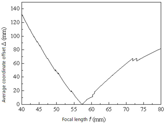 Through numerical simulation analysis in the author’s doctoral dissertation, it was demonstrated that slight variations in the focal length have a significant impact on measurement errors [24]. As shown in Figure 5, the simulation results reveal the relationship between focal length within a certain range and measurement accuracy. By performing a global scan within the possible range of focal length values and selecting the value that minimizes the error, this approach embodies the principle of global scanning.