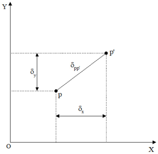 where δ x and δ y are the combined values of nonlinear distortion in the x-axis and y-axis directions of the image-plane coordinate system; δ j x and δ j y are the radial distortion parameters in the x-axis and y-axis directions; and δ l x and δ l y are the decentering distortion parameters in the x-axis and y-axis directions of the image-plane coordinate system. δ b x and δ b y are the thin-prism distortion parameters in the x-axis and y-axis directions of the image-plane coordinate system; k 1 and k 2 are radial distortion coefficients; q 1 and q 2 are decentering distortion coefficients; and s 1 and s 2 are thin-prism distortion coefficients. The spatial relationships of δ x and δ y within the image-plane coordinate system are illustrated in Figure 6.