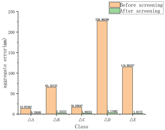 By subtracting the point distances measured in Table 3 and Table 5 from the point distances measured by the total station in Table 11 and Table 12, the measurement errors of the simulation validation experiment, as shown in Table 13 and Table 14, can be obtained. In the tables, a , b , c , d , and e represent the errors between the coordinates of each test point and the true values in the measurement results before control point selection, while a , b , c , d , and e represent the errors after control point selection.