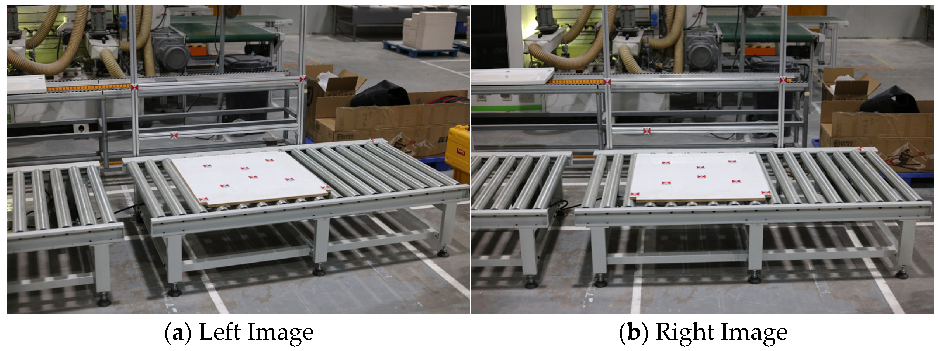 Additionally, in complex production environments, external factors such as lighting variations, vibrations, and high-reflectivity surfaces can significantly affect the accuracy of traditional visual recognition methods [8]. For example, uneven lighting can cause variations in image brightness, vibrations can lead to image blurring, and reflective surfaces can interfere with image quality, thereby affecting feature extraction and object localization [9]. To address these challenges, close-range photogrammetry technology has gradually become an effective solution. By extracting geometric features from images, close-range photogrammetry not only enables high-precision three-dimensional measurement and object identification without physical labels but also operates without human intervention. This technology can stably perform precise object localization and identification in dynamic and complex production environments, avoiding the instability associated with traditional methods.