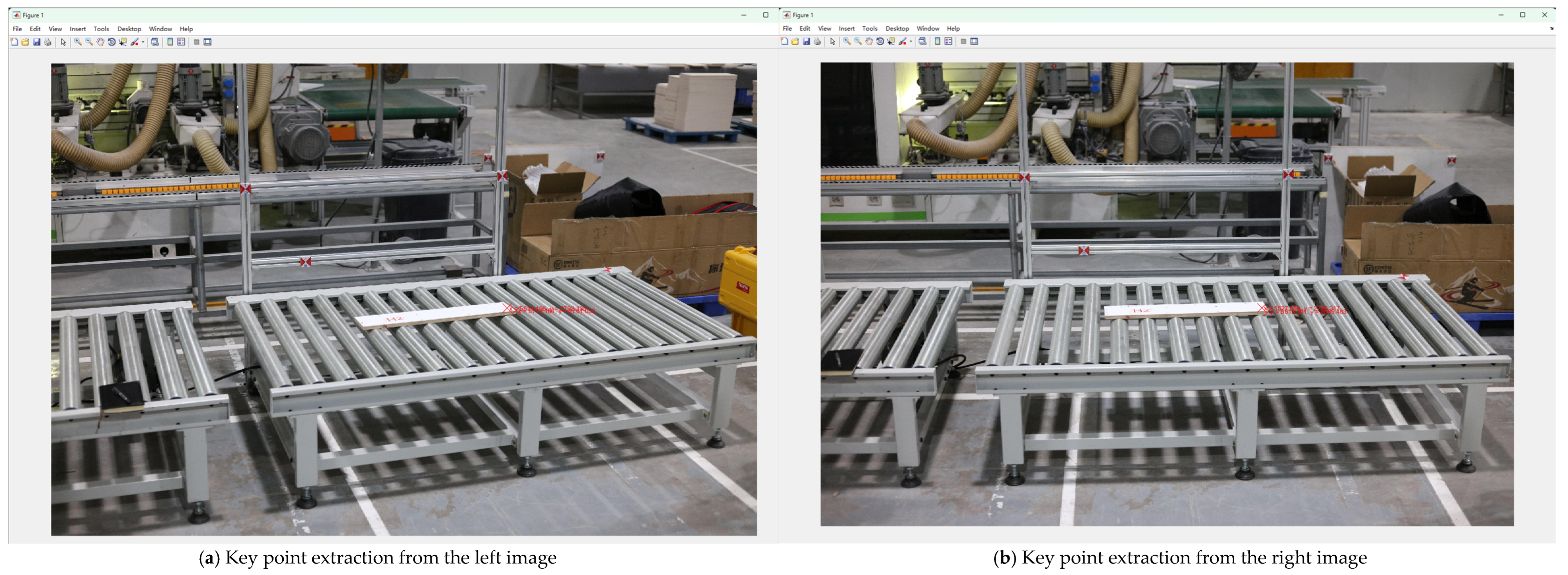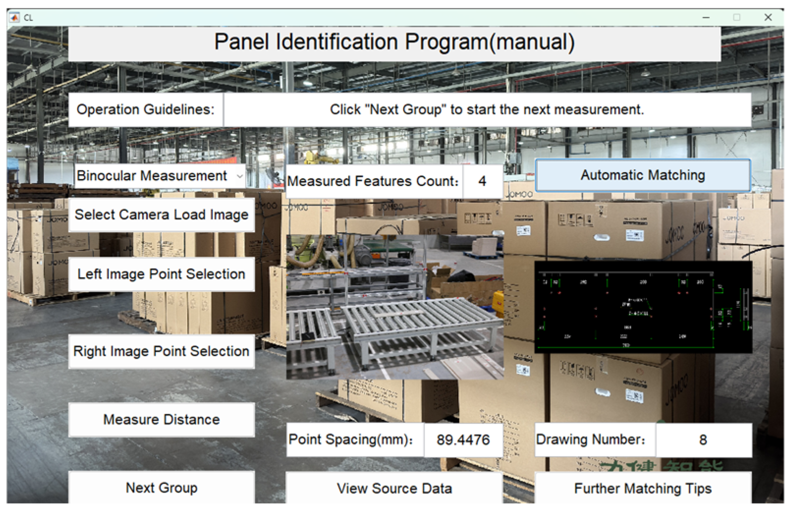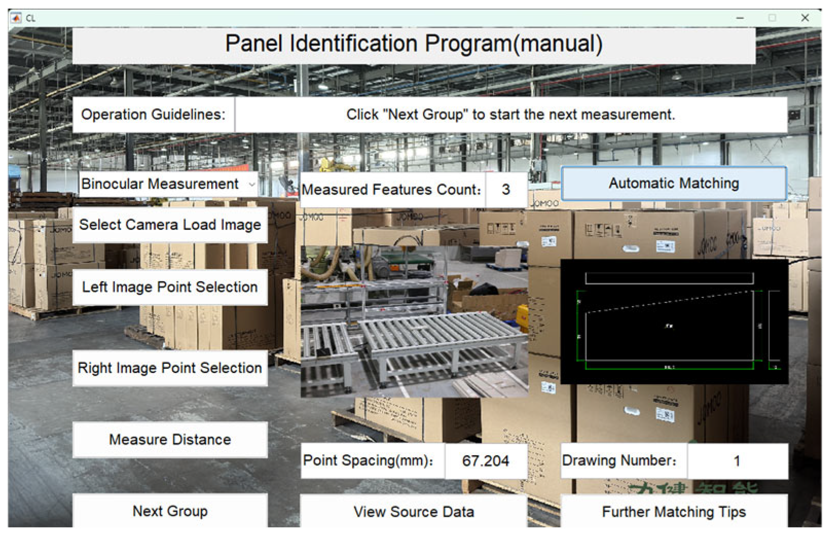 Ultimately, the system performs a weighted fusion of dimension and hole features to generate a unique identity, which is then used for comparison with the standard panel database. This method does not require physical labels and achieves high identification accuracy, making it suitable for the automated sorting of panels with multiple specifications and without markings. However, in actual production line environments, factors such as vibration, noise, and optical distortion of the camera lens can affect recognition accuracy. Therefore, although the feature-weighted fusion method exhibits high accuracy in theory, to address the instability factors present in production line environments, this study proposes a control-point and pointer-point weighted selection method based on an optical distortion model to further enhance calibration precision.