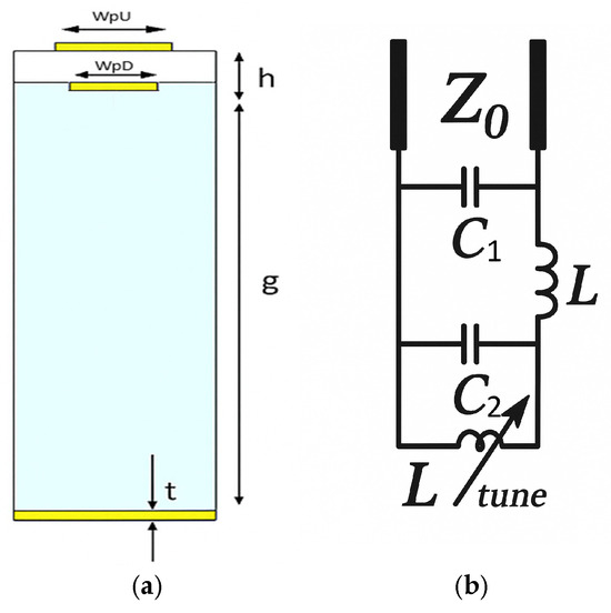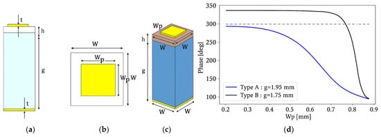 Figure 9a, the cell comprises two coaxially aligned copper patches, an upper element (WpU) and a lower element (WpD), separated by a thin dielectric spacer. The lower patch is positioned above a continuous metal ground plane, with the intervening air gap g providing the principal tuning mechanism.