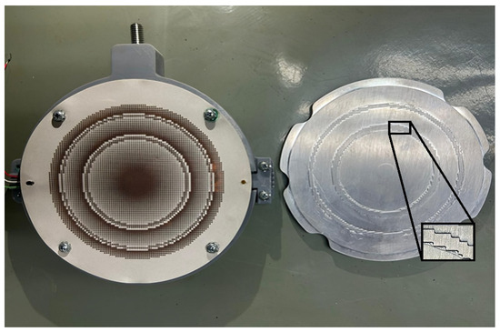 Figure 3, right, the metal ground plate has milled contours that follow the arrangement of Type-A and Type-B unit cells. The manufacturing accuracy of the two-step ground plate was 10 µm. Rogers 5880 was used as the substrate for the front-side PCB (