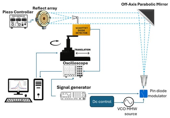 Figure 5. A W-band VCO serves as a tunable millimeter-wave source operating from 78 to 82 GHz. The signal is amplitude-modulated using a PIN switch with on–off (square-wave) 1 kHz modulation. A W-band horn couples the radiation toward an off-axis parabolic (OAP) mirror, f = 150 mm, which collimates the beam and directs it onto the REMR. The beam reflected from the REMR is detected by a Schottky-diode detector fed by a waveguide probe; the probe’s active receiving area is 4.8 mm