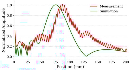 Figure 6) is compared with simulation results (solid green line). While simulations predict a focal peak at 76 mm, the experimental maximum occurs at 81 mm, likely due to assembly tolerances and phase-quantization steps. Minor ripples near the transmit frequency, caused by internal reflections, can be mitigated by optimizing absorber placement or slightly offsetting the detector [