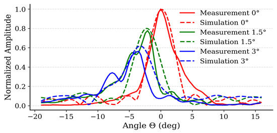 Figure 7 shows the simulation results (dashed line), and the measured results for three tilting cases:
