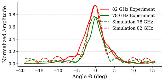 Figure 8 shows the far-field directivity patterns of the RERM for 78 GHz and 82 GHz. Both simulations (solid lines) and experimental results (dashed line) are in excellent agreement.