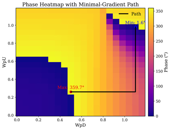 overlaid with a black path computed via Dijkstra’s algorithm. We use Dijkstra because, on a grid with non-negative edge weights defined by local phase differences, it provably finds the least-cost route and thus identifies the discrete path of minimal cumulative phase change (i.e., the least-gradient path), yielding the smoothest phase progression for stable beam steering.
