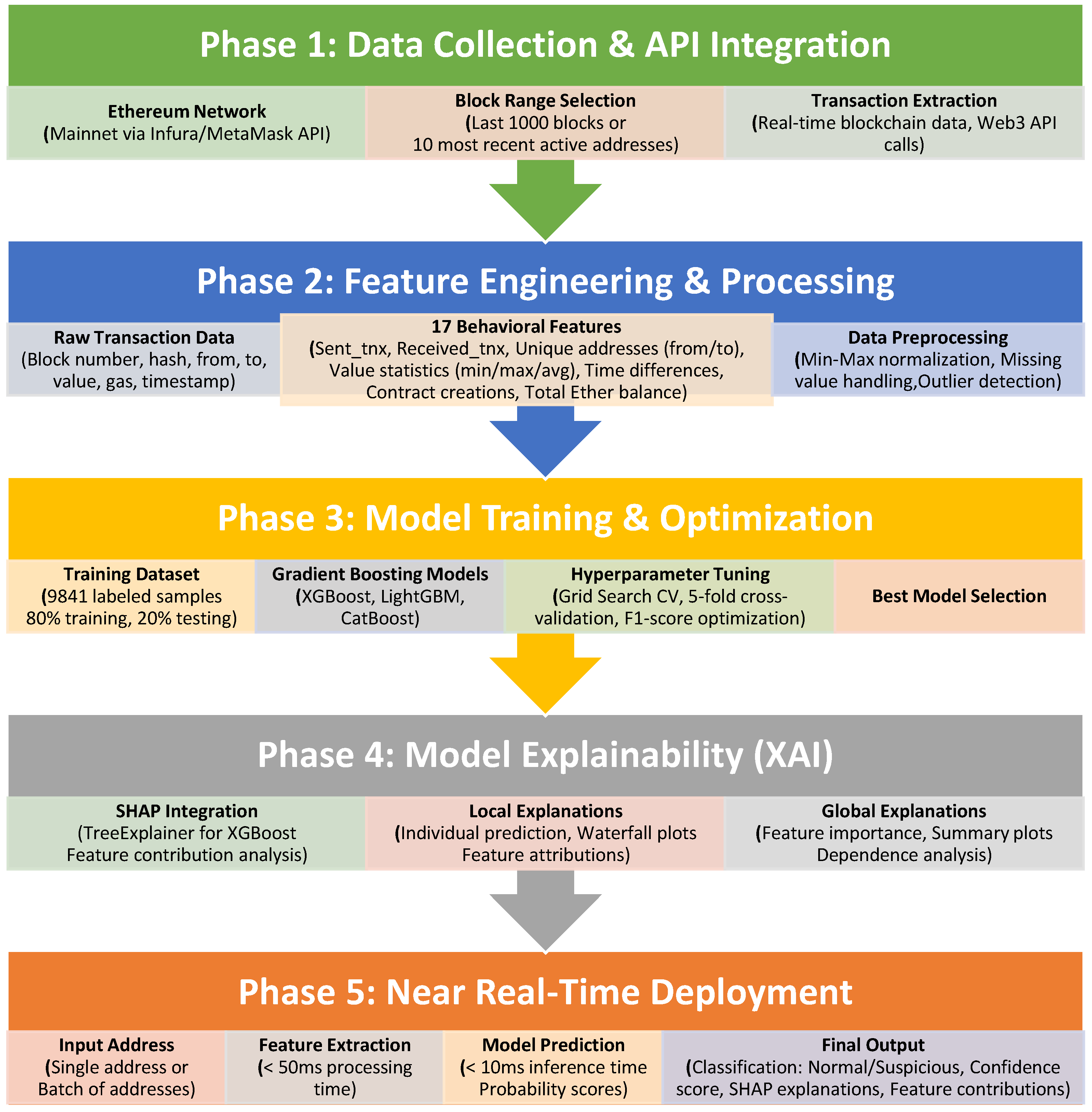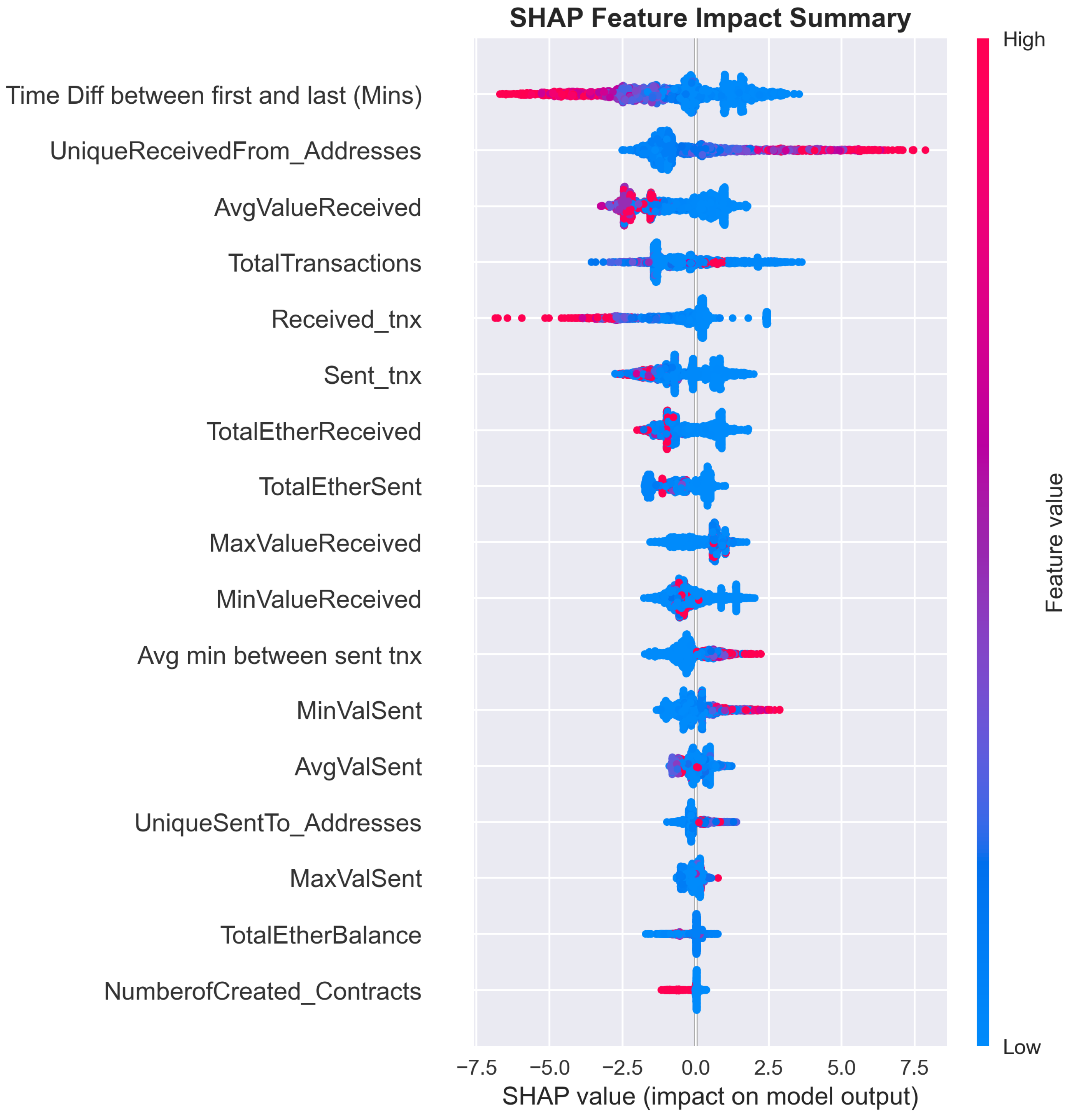 - In order to enhance the interpretability of the model and thus support trust in automated decision-making processes, explainable artificial intelligence (XAI) techniques were incorporated. These techniques facilitate the attribution of model predictions to specific features or behaviors, thereby providing transparency into the rationale behind the classification of a wallet as suspicious.