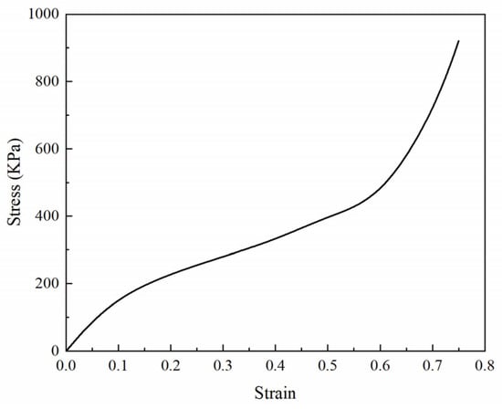 This study utilizes a standard second-class double seat from a Chinese high-speed train. The base frame employs aluminum alloys, while the backrest and armrests use magnesium alloy. The tray table is made of plastic. The material parameters are shown in Table 1. Identical polyurethane foam is used for both seat and back cushions, with its test performance curve shown in Figure 1. The seat’s finite element model (Figure 2a) omits non-structural components, comprising 147,753 shell elements, 89,220 solid elements, and 69 beam elements. As illustrated in Figure 2b, the backrest pivots on two rotating shafts via support arms, connected to the central bracket by a gas spring. This spring fully extends when upright and fully compresses at maximum recline. It automatically returns to full extension via the armrest control button unless manually locked, maintaining backrest angle stability.