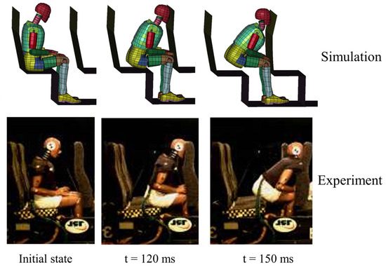 The Hybrid III 50th percentile dummy model was utilized in this study. Validation of the seated configuration was performed through comparative analysis of posture responses and head acceleration curves against established experimental data []. The simulation model replicated documented test conditions, including contact parameters and acceleration loads. Results demonstrated strong agreement with physical test kinematics as shown in Figure 3 and Figure 4. Although the simulated head acceleration profile closely matched experimental trends, peak magnitudes exceeded physical test measurements due to unmodeled seat energy-absorption characteristics. This conservative overestimation of head acceleration, attributed to higher energy transfer during impact, provides methodologically acceptable injury assessment by preventing potential risk underestimation.