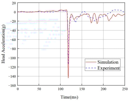 Comparison of experimental and simulated head acceleration curves in dummy tests.