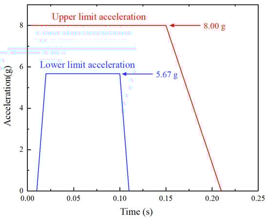 The trapezoidal acceleration pulse specified in the UK GM/RT2100 standard (Figure 5) was employed, with its upper boundary initially peaking at 8 g and maintaining this level until 0.15 s before linearly decreasing to 0 g at 0.21 s; simultaneously, the lower boundary linearly increased from 0 g at 0 s to 5.67 g at 0.01 s, maintained this value until 0.10 s, then linearly decreased to 0 g at 0.11 s. In accordance with EN15227 [], the initial velocity of the dummy-seat system was set at 36 km/h (10 m/s).