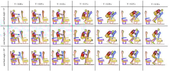 Simulation process of the dummy-seat system under different seat back angles during collision.