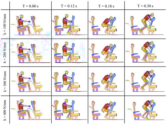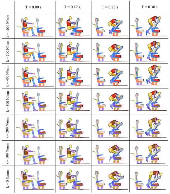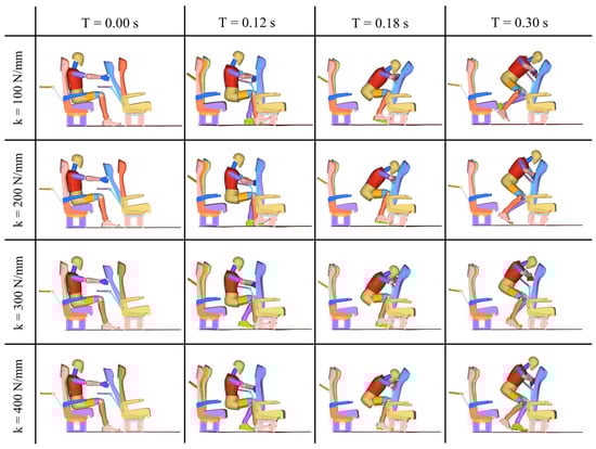 As shown in Figure 10, the four models arranged top-to-bottom represent connection stiffness values of 100 N/mm, 200 N/mm, 300 N/mm, and 400 N/mm between the seatback and base. During collision simulation, all four configurations exhibited nearly identical kinematic states at four critical timestamps. At 0.12 s post-impact, dummies uniformly lost seat cushion contact while making simultaneous hand and knee contact with the front-row seatback. By 0.18 s, the tray table displaced toward the vulnerable cervical region, posing critical safety concerns. At 0.30 s, occupant–seat separation was substantially achieved, concluding the simulation.